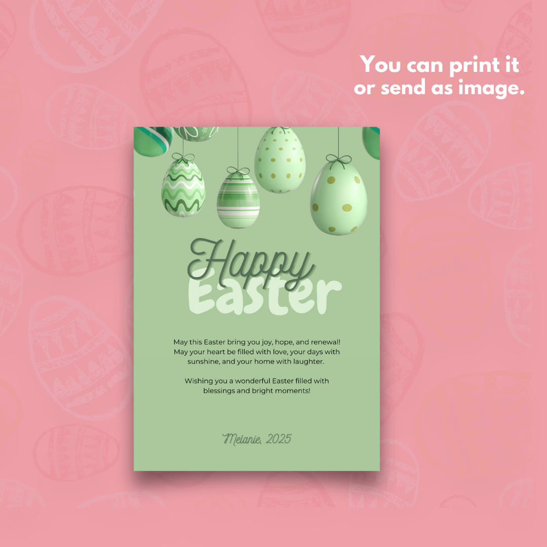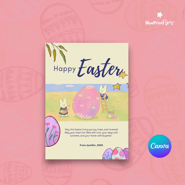 This cartoon-style Easter card template features beautifully decorated and painted eggs, symbolizing rebirth, joy, and togetherness. Perfect for sharing warm wishes with family and friends, this design is fully editable, allowing you to personalize it with your own text. Whether you want to print it or send it as a digital message, this Easter card will help you celebrate this special moment in style.