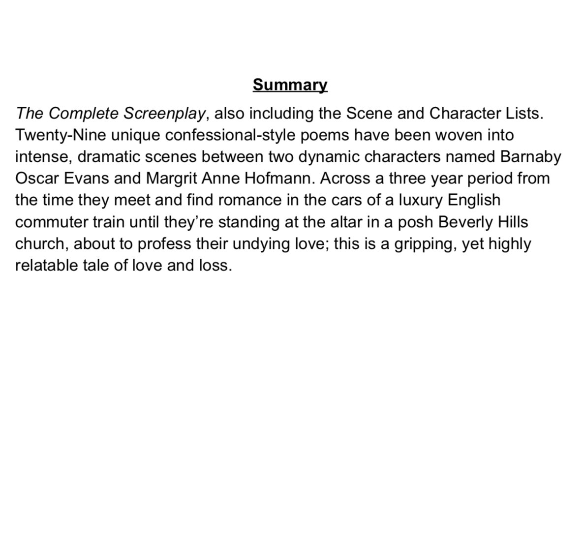 The Complete Screenplay, also including the Scene and Character Lists. Twenty-Nine unique confessional-style poems have been woven into intense, dramatic scenes between two dynamic characters named Barnaby Oscar Evans and Margrit Anne Hofmann. Across a three year period from the time they meet and find romance in the cars of a luxury English commuter train until they’re standing at the altar in a posh Beverly Hills church, about to profess their undying love; this is a gripping, yet highly relatable tale of love and loss.