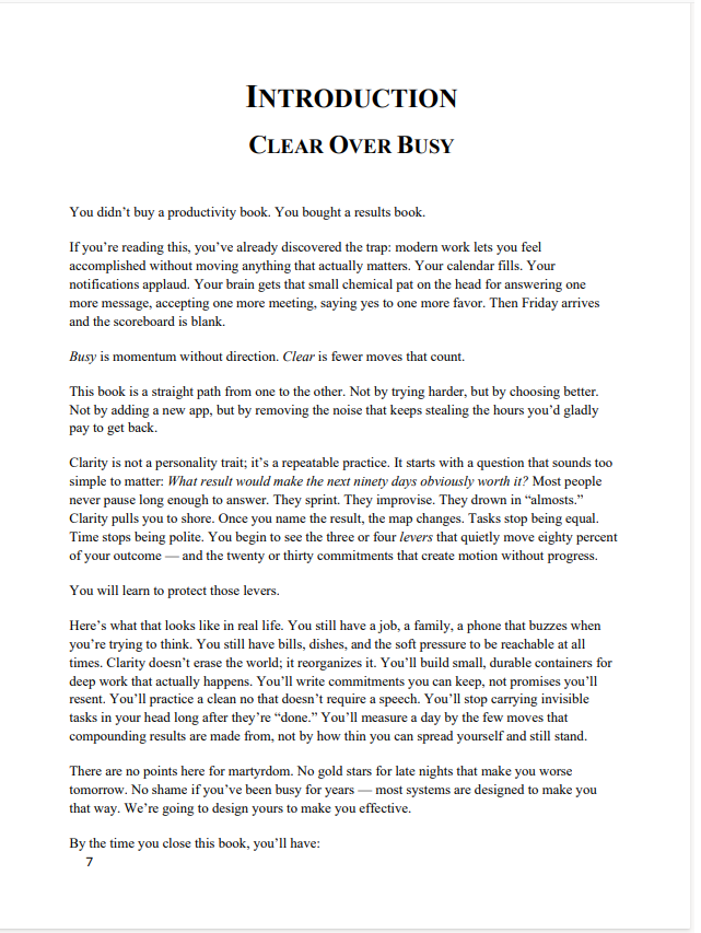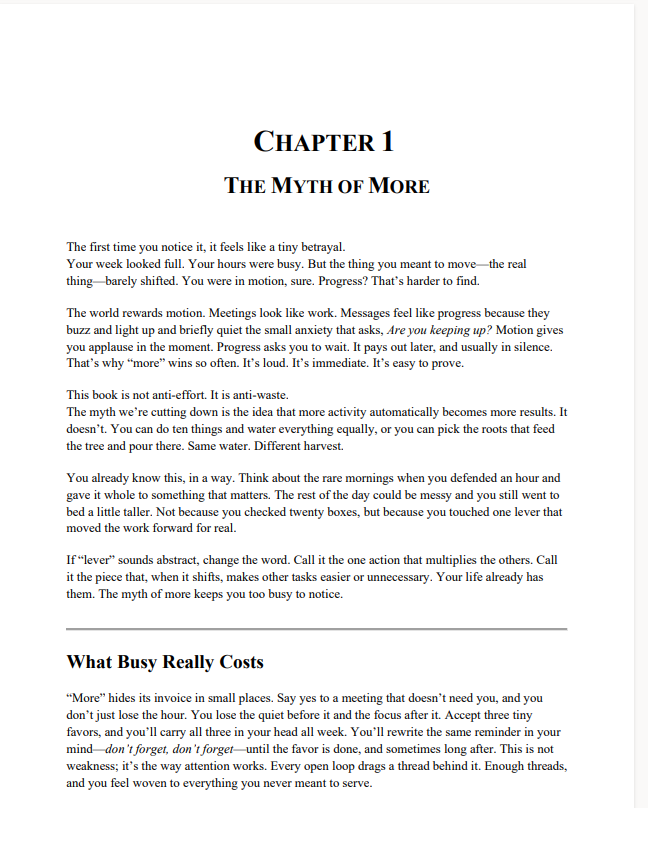 Your calendar is full. Your results feel thin. This book fixes that—without hacks, hype, or a new personality. In crisp, human prose, J.D. Veyne shows you how to name one finishable result, find the few levers that move it, and turn calendar blocks into rooms your body obeys. You’ll learn the Kind No that protects your best hour, the Proof Loop that makes action easier tomorrow, and the Return Skill for coming back fast after messy weeks. The outcome: a week that breathes, a season that holds, and work that exists—pages written, offers shipped, projects finished.