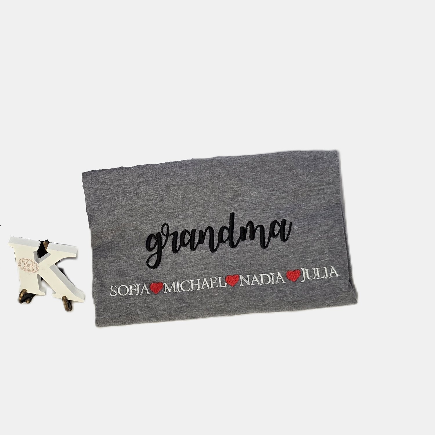 Each grandchild’s name is custom embroidered beneath “Grandma,” creating a wearable tribute to her greatest joys.