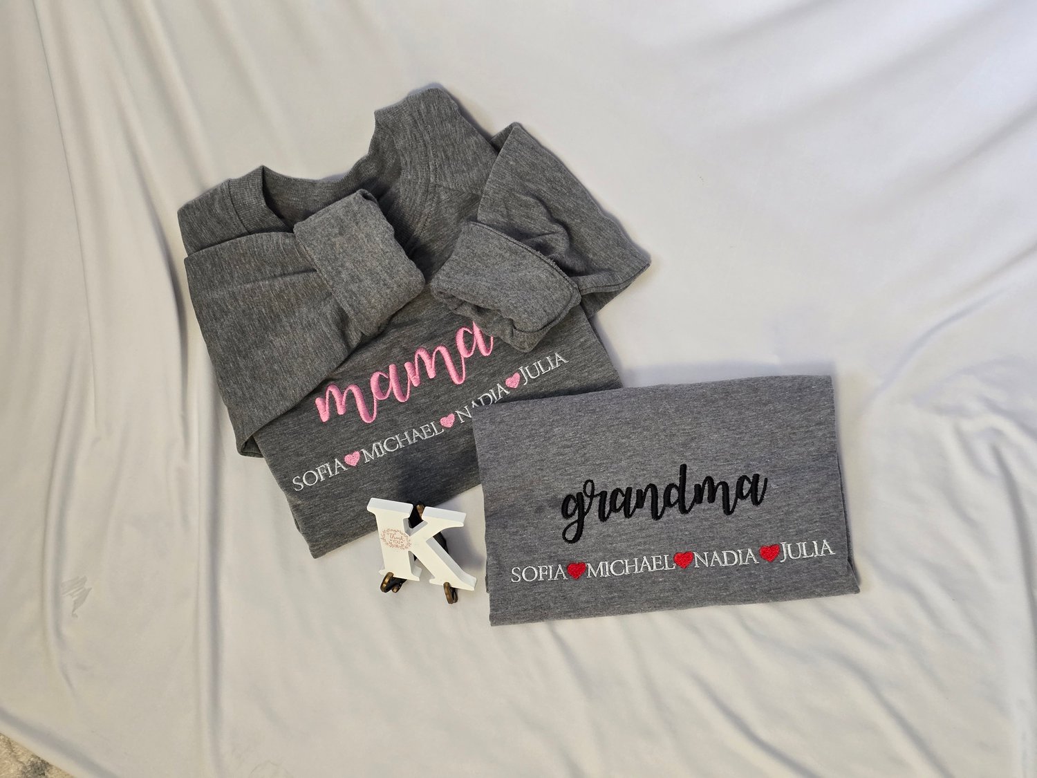 Our signature “Grandma” embroidered sweatshirt is delicately stitched in an elegant script, with each grandchild’s name beautifully embroidered beneath — separated by subtle heart detailing. Designed to be worn, treasured, and kept for years to come.