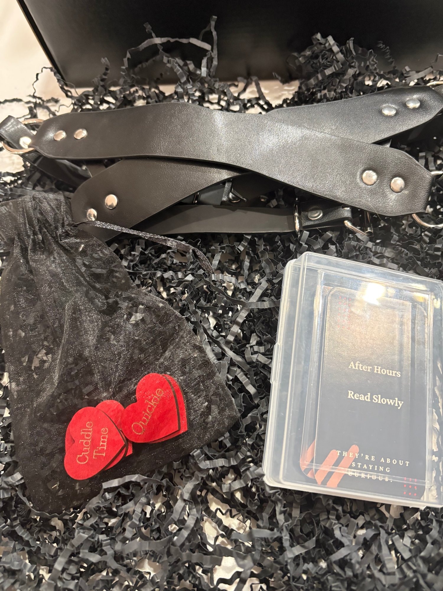 - After Dark play bag (mask, conversation cards, and wooden tokens)