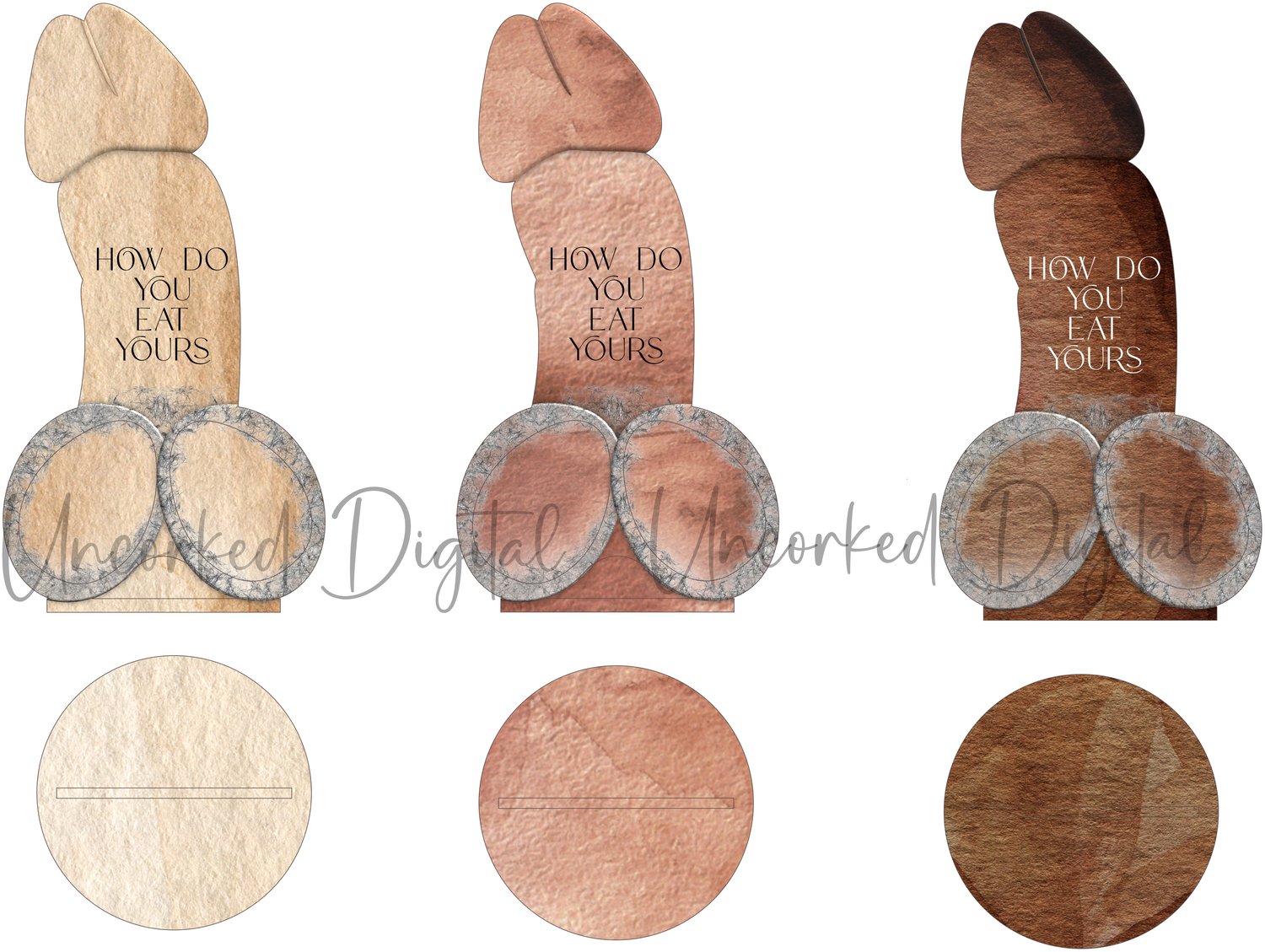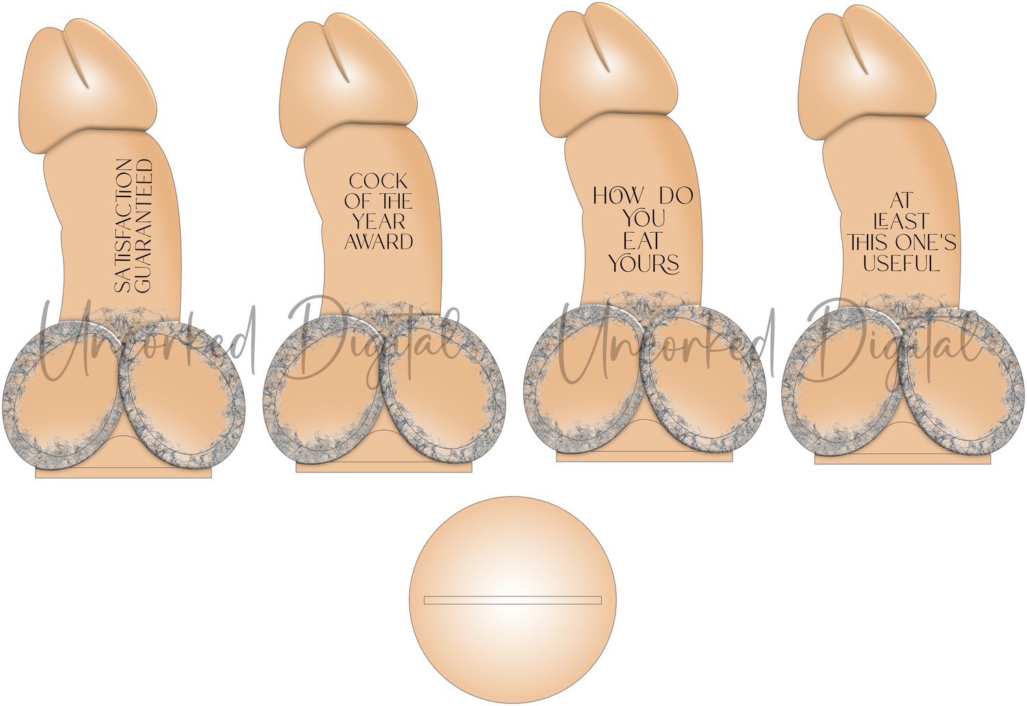 Included are 1 Easter Willy, 1 plain Willy, 3 skin tone willies with matching bases and 7 sets of text in black and white for you to place on before printing or use your own text and fonts.