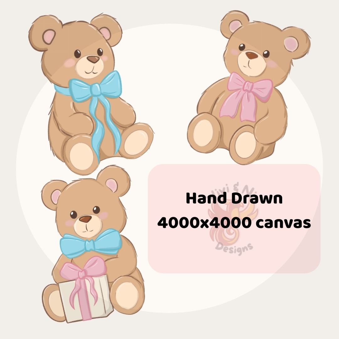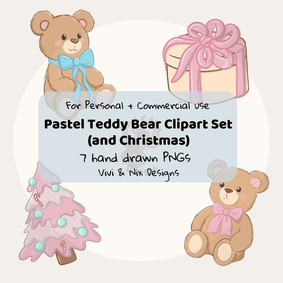 This Pastel Teddy Bear Clipart Set features soft kawaii bears, a pink Christmas tree, ornaments, and a sweet holiday gift box. Perfect for creating stickers, sublimation designs, mugs, T-shirts, planners, kids’ crafts, printable holiday cards, and small-business products.
