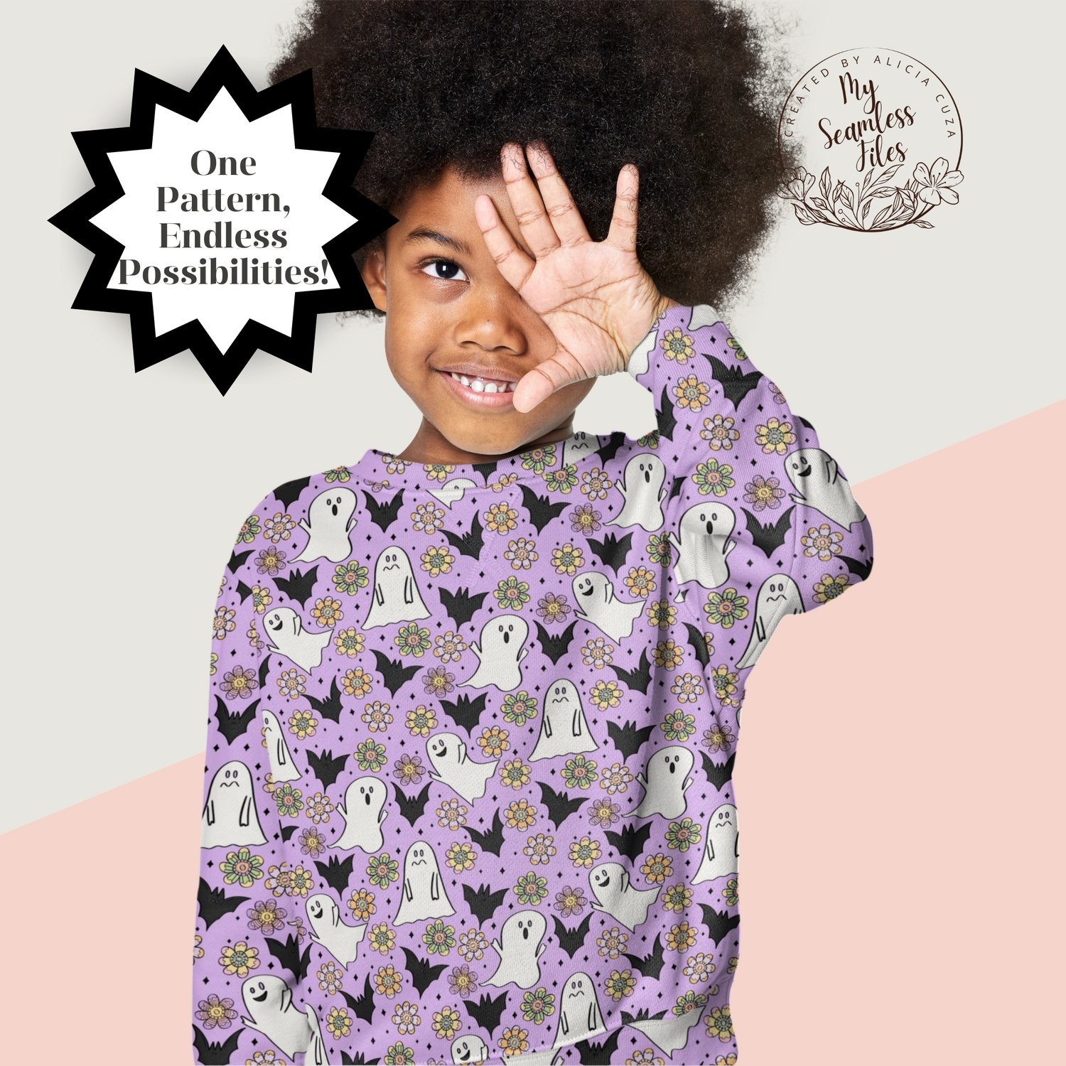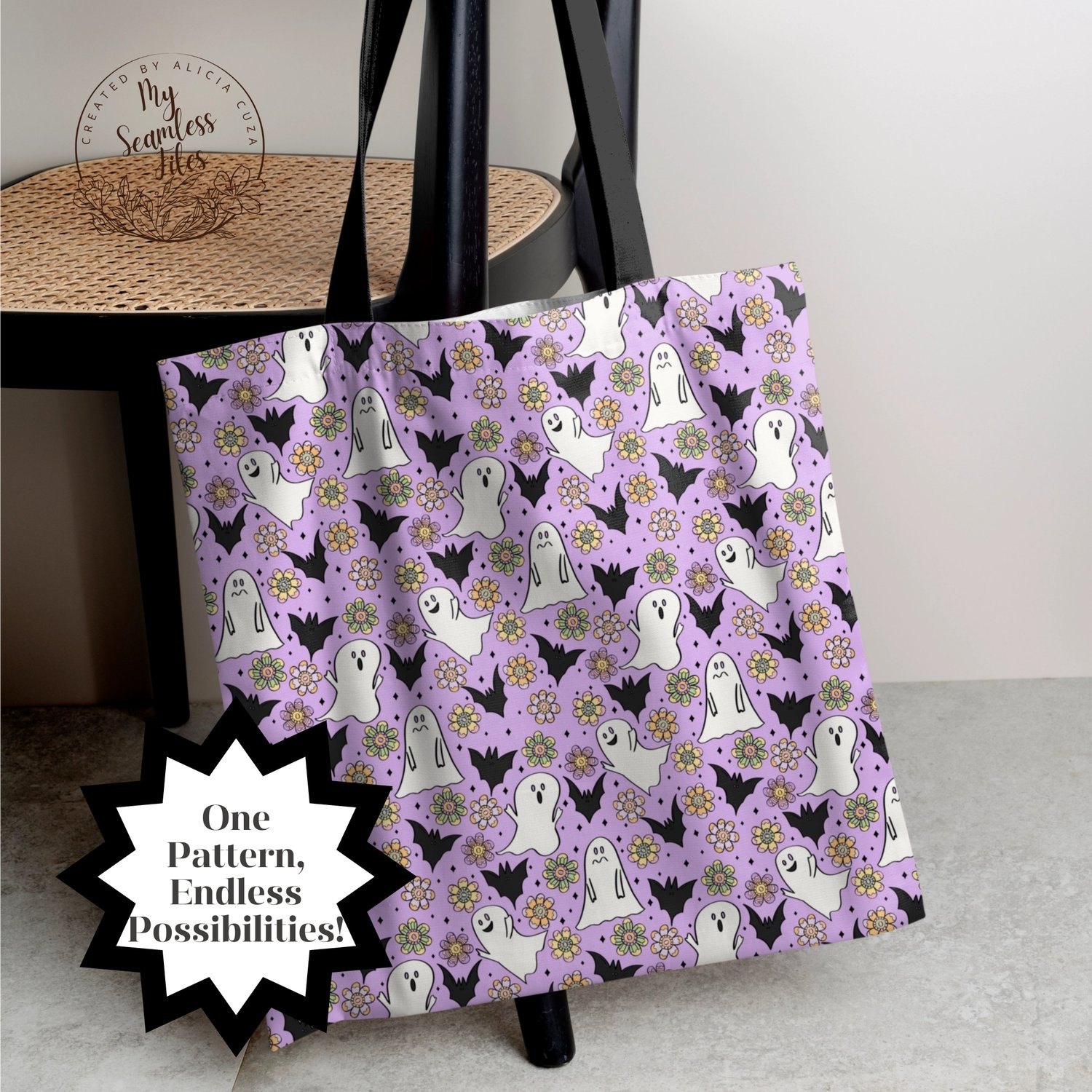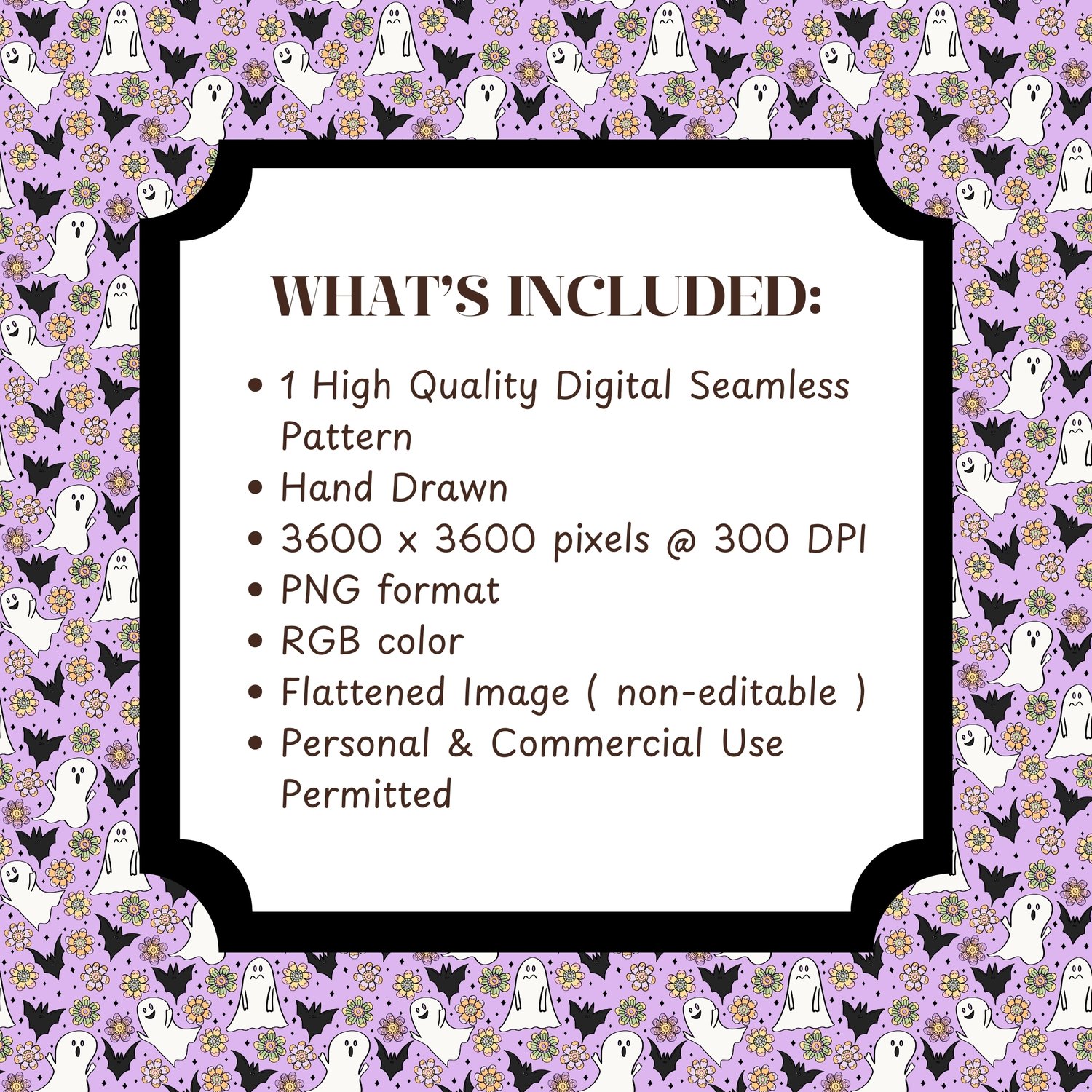 🎃 Create magical Halloween projects with this charming seamless ditsy pattern featuring friendly ghosts, bats, and beautiful flowers! This hand-drawn design showcases adorable white ghosts with sweet expressions, black bats, and colorful retro flowers scattered on a lovely lavender purple background with sparkly diamond accents.
