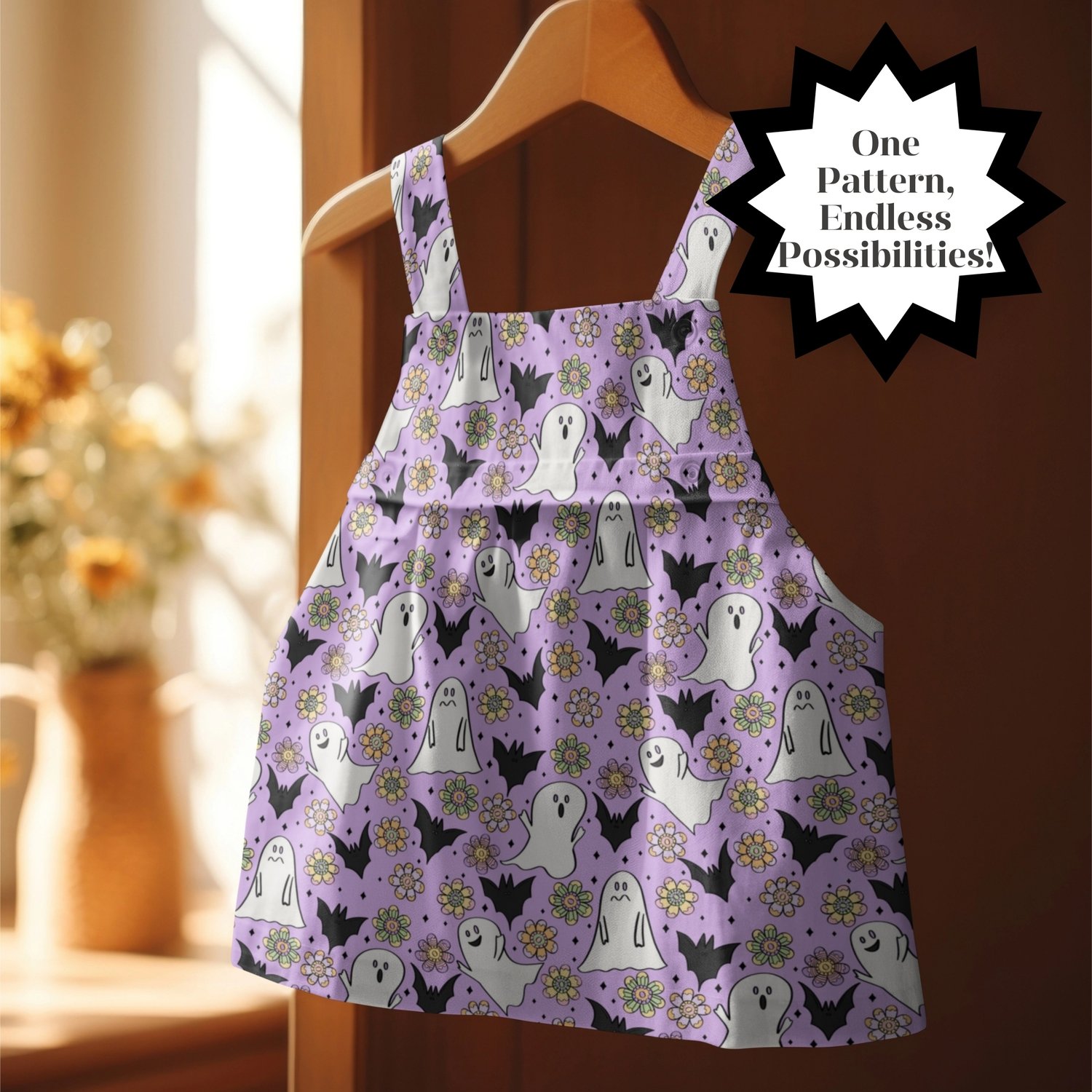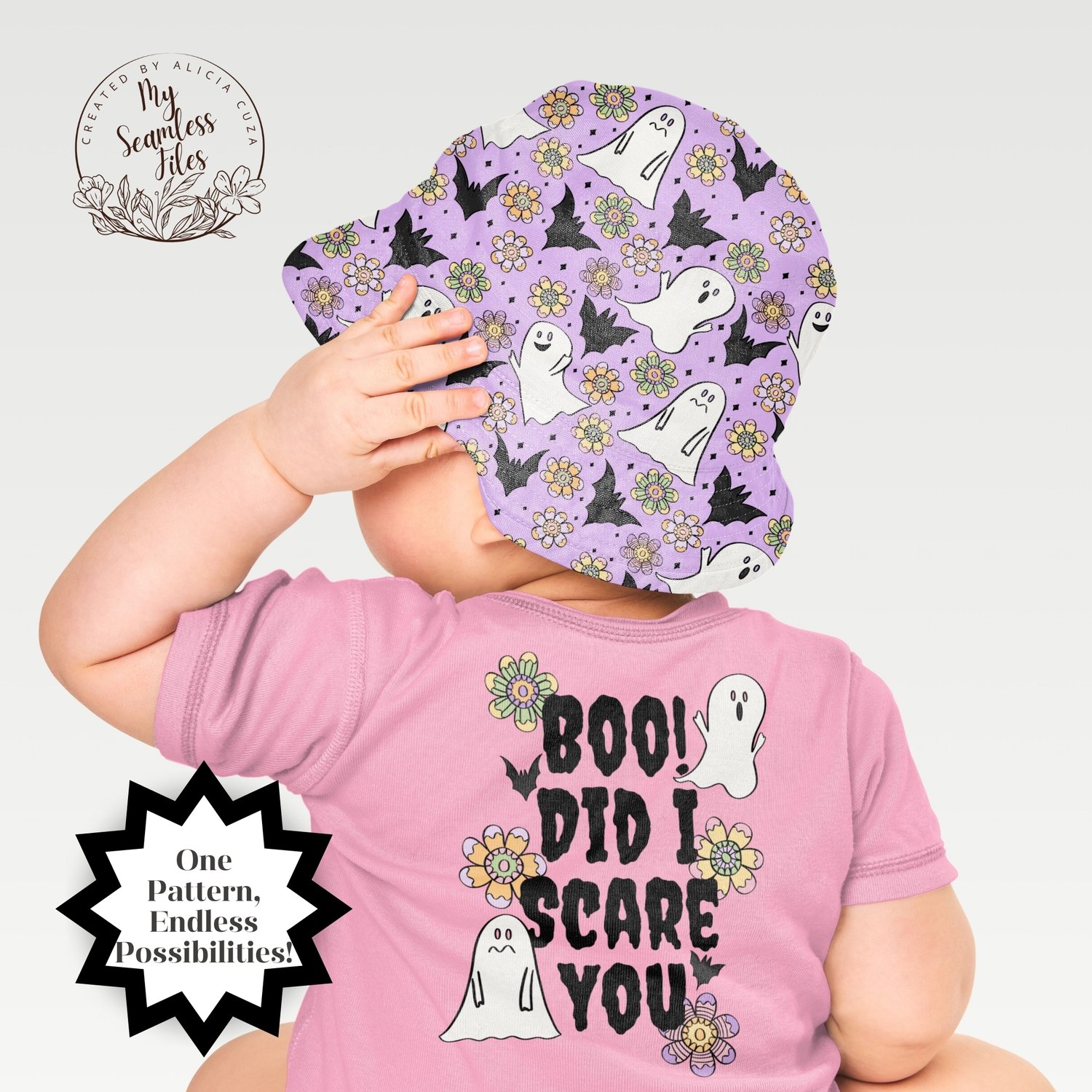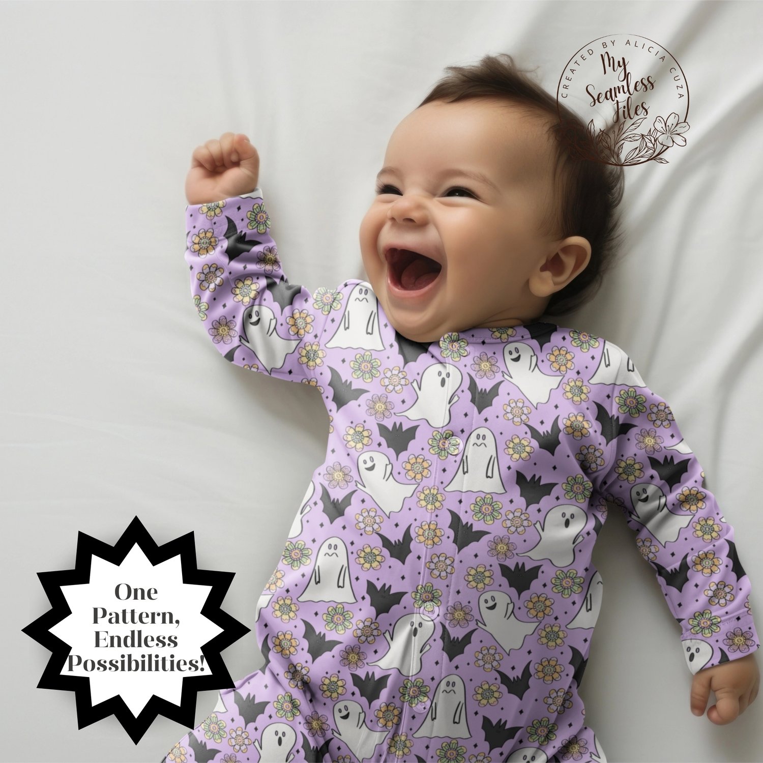 🎃 Create magical Halloween projects with this charming seamless ditsy pattern featuring friendly ghosts, bats, and beautiful flowers! This hand-drawn design showcases adorable white ghosts with sweet expressions, black bats, and colorful retro flowers scattered on a lovely lavender purple background with sparkly diamond accents.