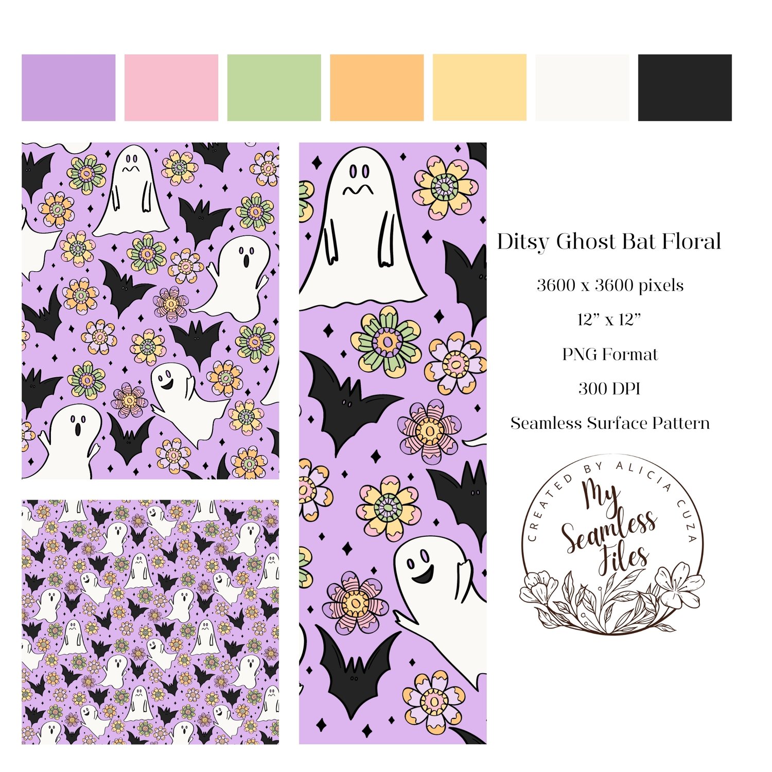 INSTANT DOWNLOAD - PURPLE HALLOWEEN DITSY GHOST BAT FLOWER SEAMLESS PATTERN