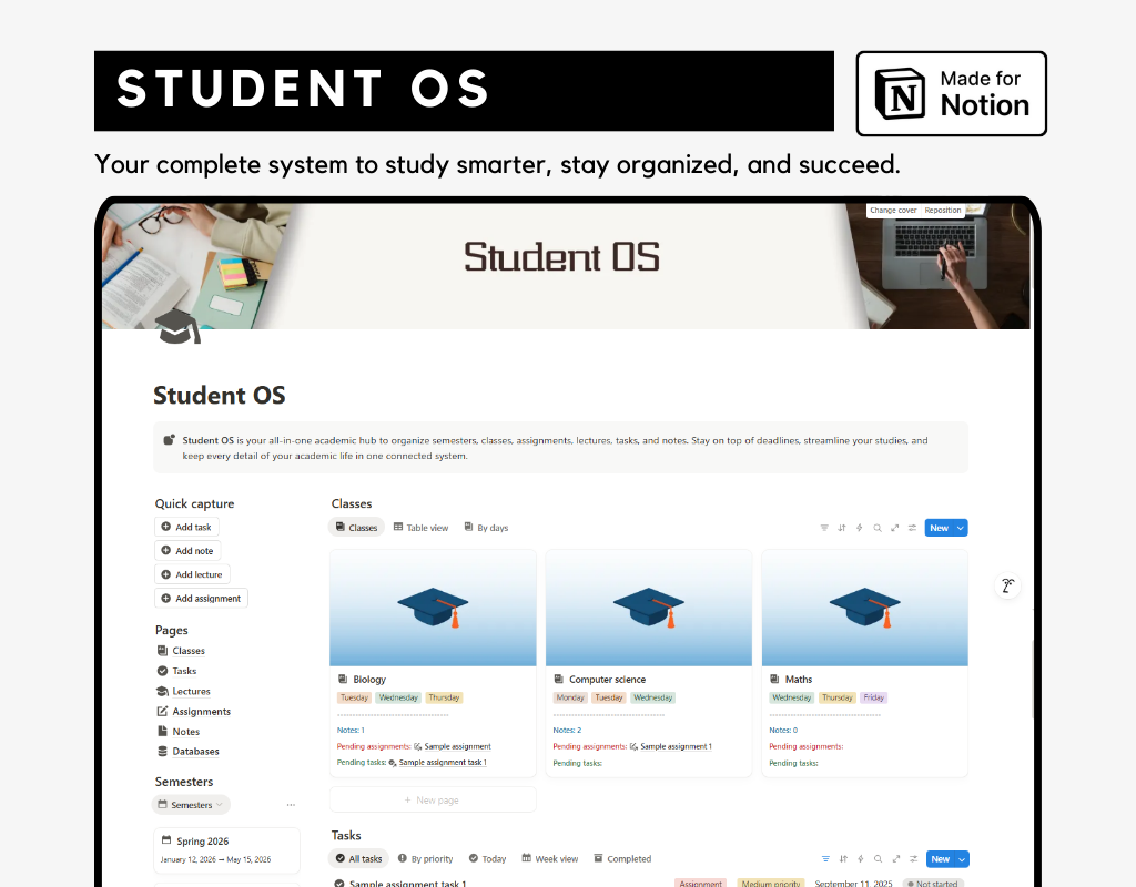 Timeblock OS is a productivity-focused Notion template designed around the principles of timeblocking. It helps you structure your day, prioritize your work, and maximize focus by combining a Tasks database with a Timeblock Dashboard that acts as a dynamic summary of your workflow.