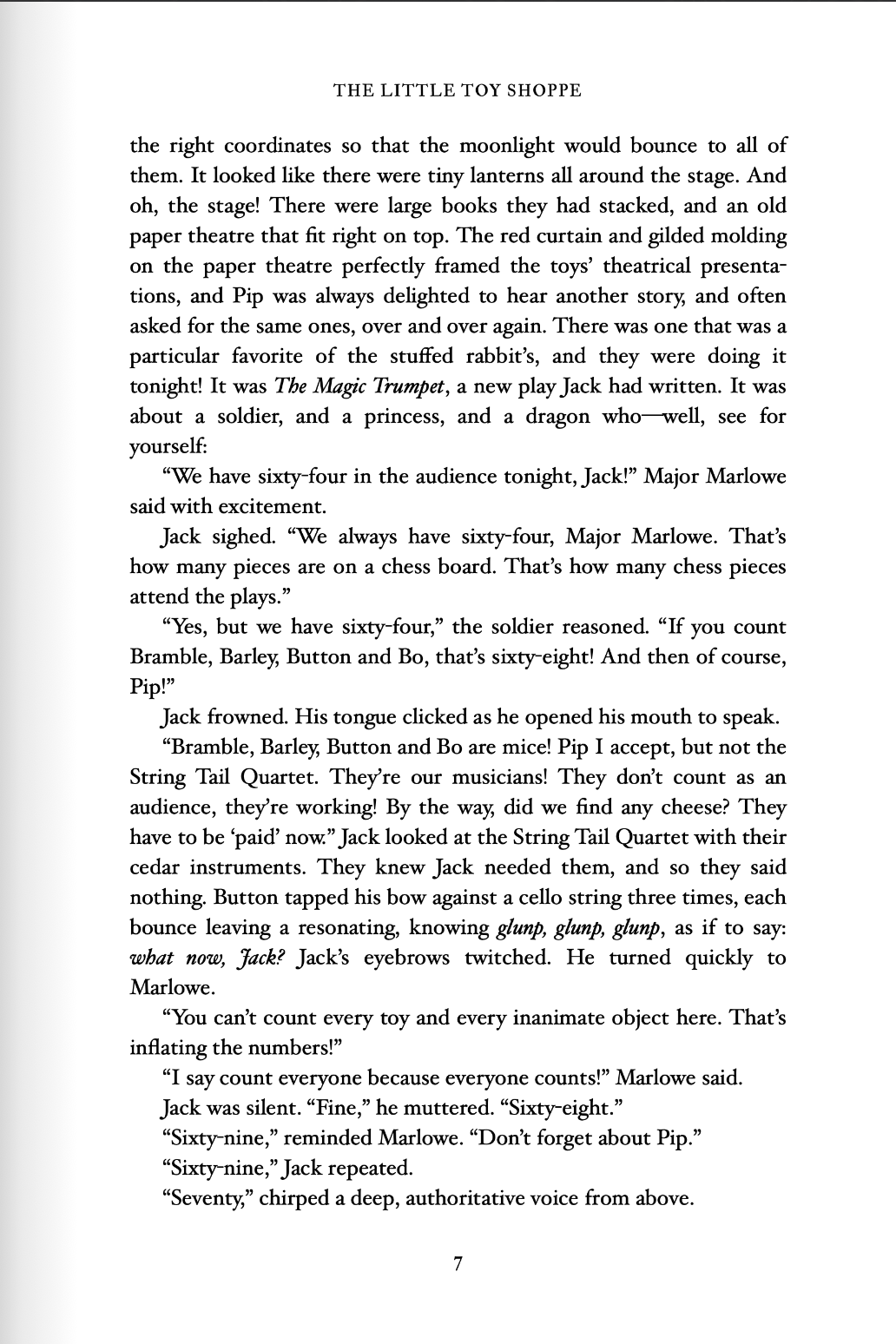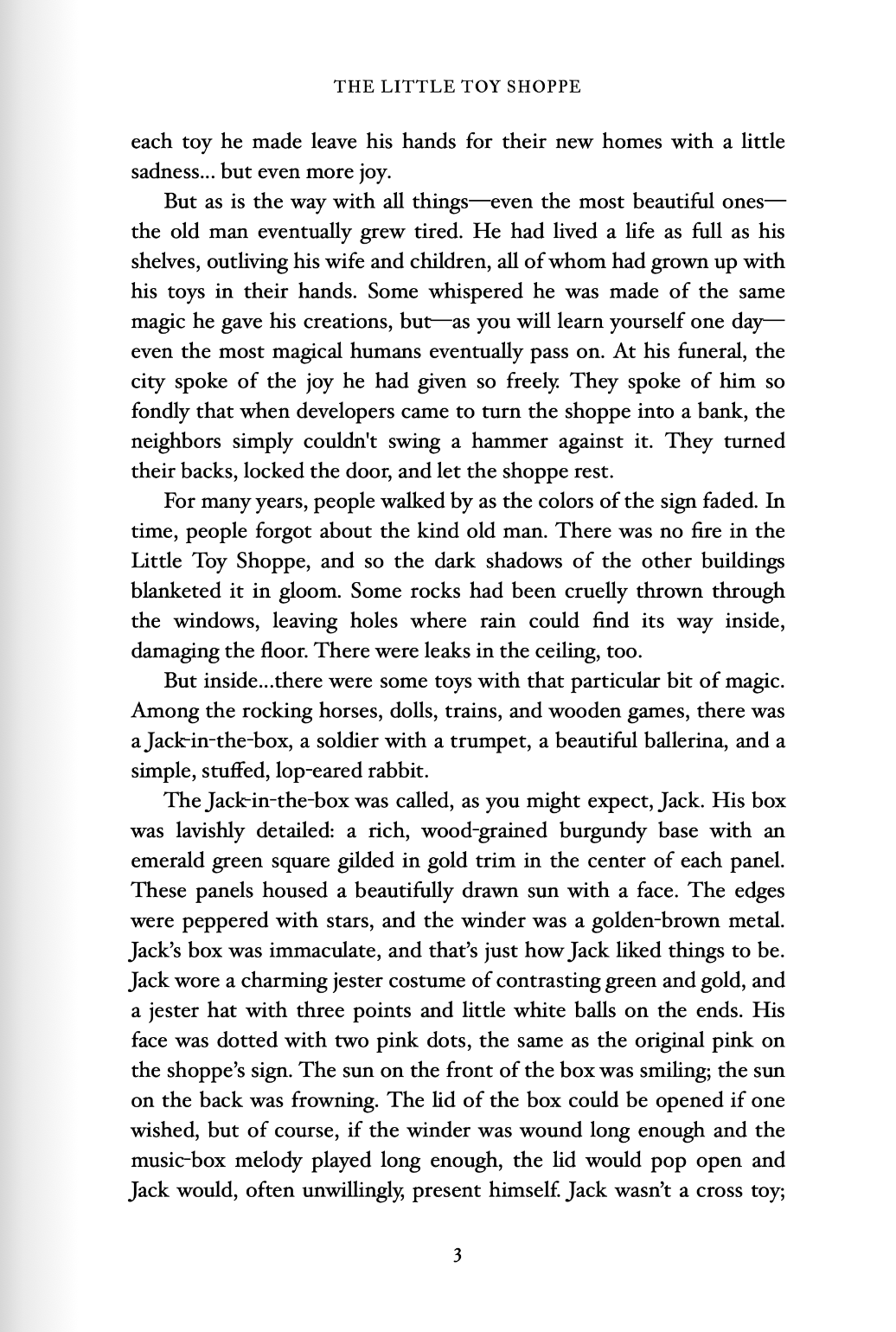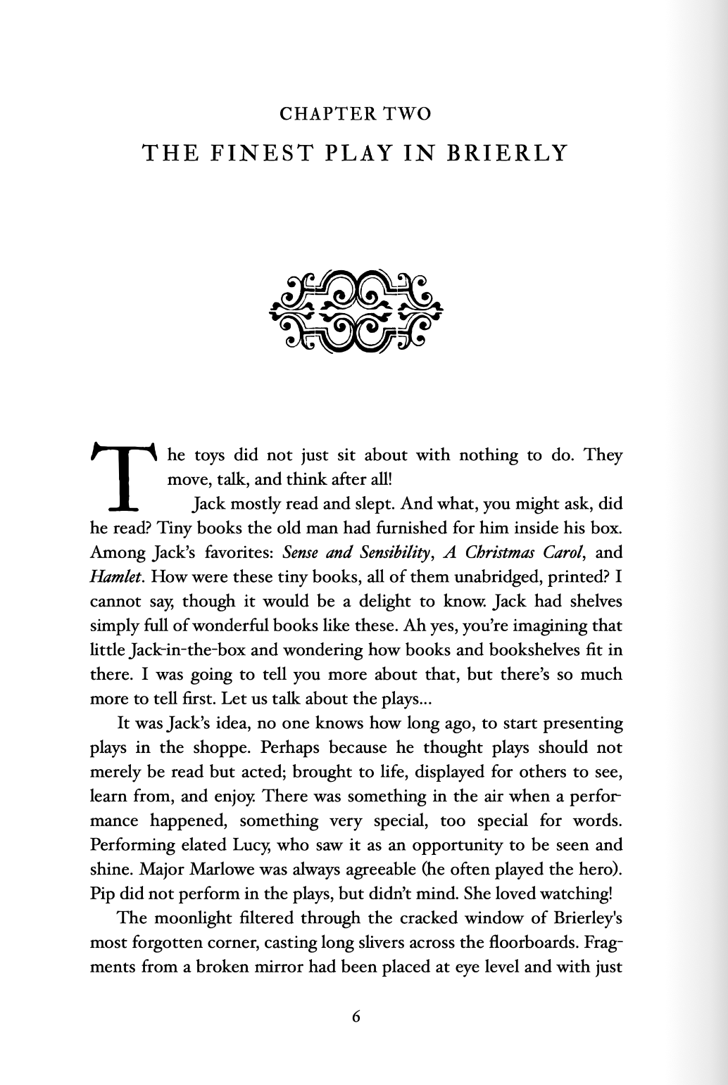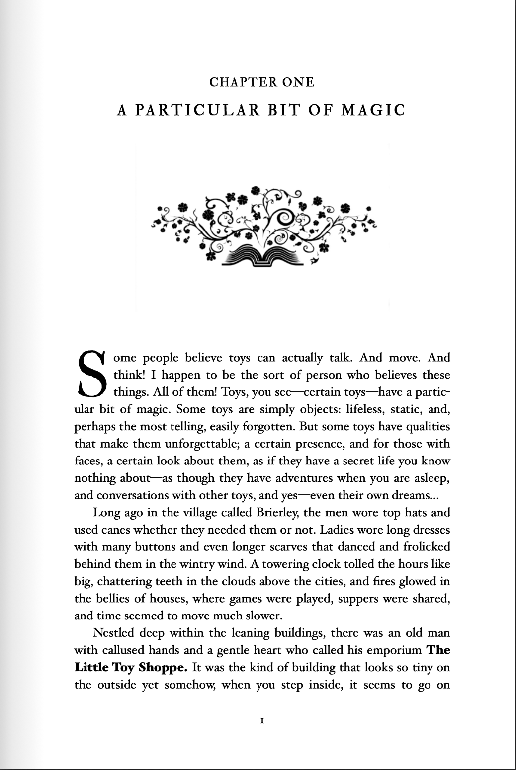 "I cannot tell you how the toys moved, spoke, or thought. I do not know how objects made of cotton and wood with stuffing for hearts feel fear, joy, or yearning. All I know is that here, in Brierly, they do. I cannot tell you how all this happened anymore than I can explain my breath or yours, the peaks of mountains scraping clouds, the sun’s infinite warmth and light, or flowers bejeweling the earth as some anonymous gift.