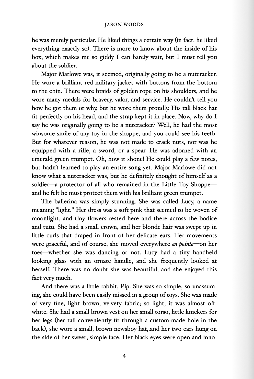 In an abandoned toy shoppe where four toys reside, there is a particular bit of magic in a solider with a trumpet, a jack-in-the-box, a ballerina, and a stuffed rabbit named Pip.