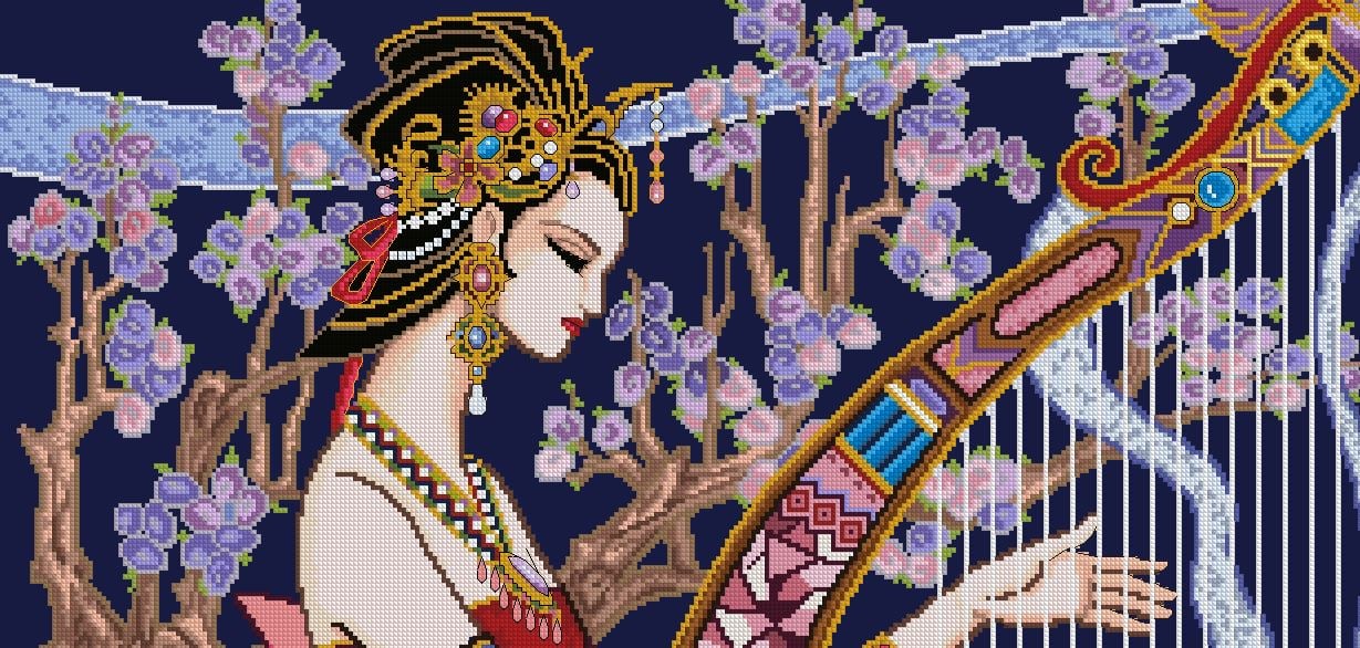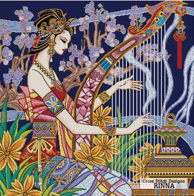 Oriental Lady of Music -Cross Stitch PDF Downloadable Pattern