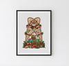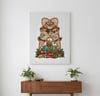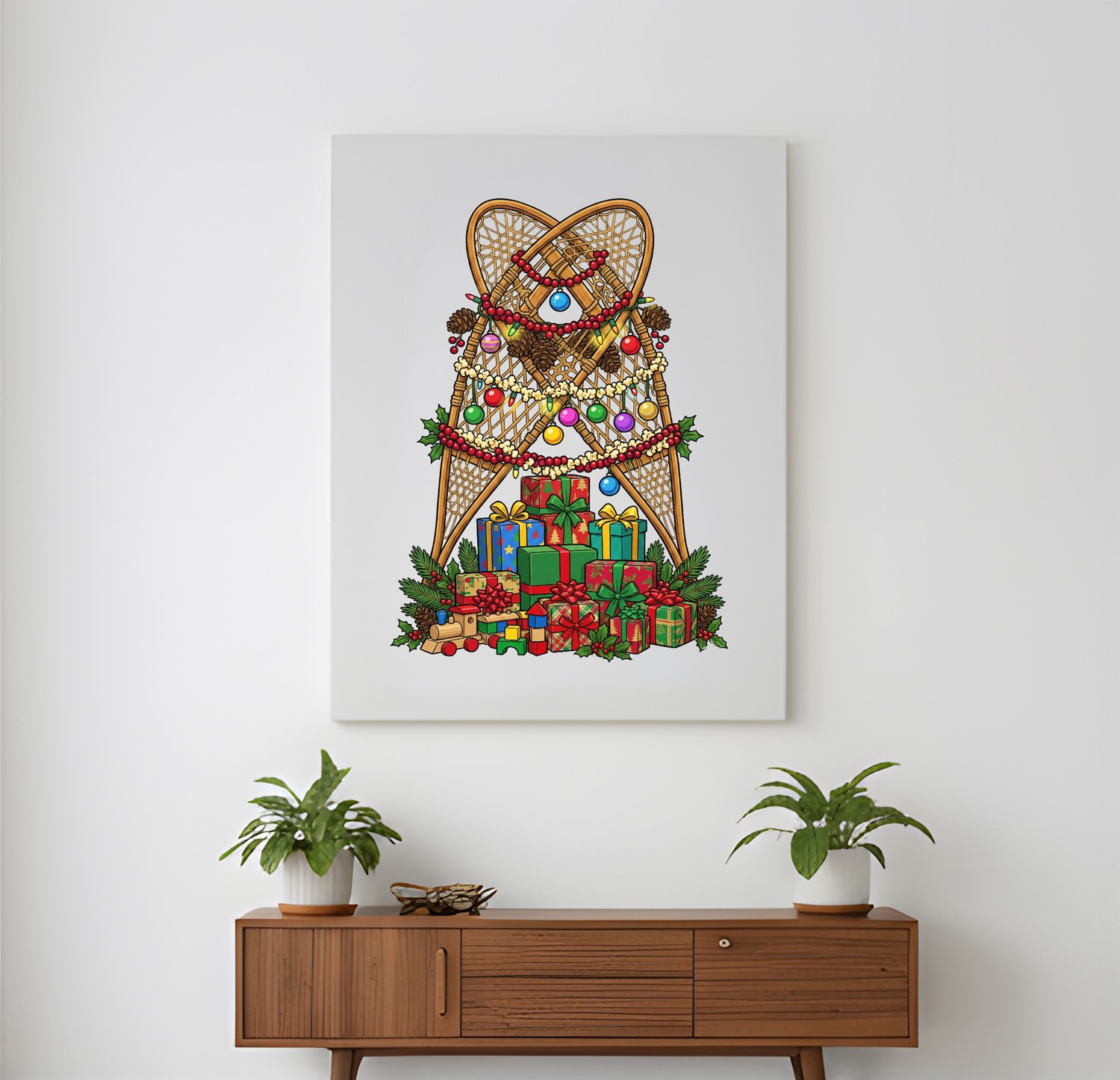 Bring cozy cabin-Christmas charm to your walls with this rustic snowshoe holiday design. Two traditional wooden snowshoes are stacked like a festive Christmas tree, decorated with garlands, berries, pinecones, ornaments, and surrounded by colorful presents. It’s a warm, outdoorsy winter vibe perfect for cabins, lodges, entryways, and anyone who loves nature-inspired holiday art.