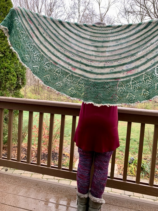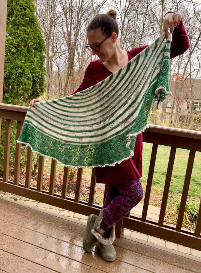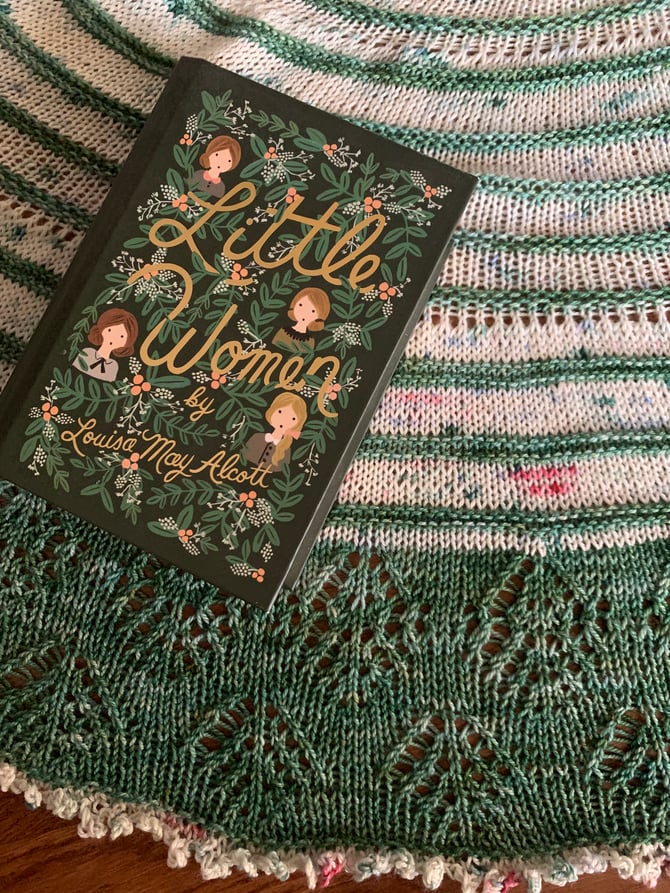 I cannot think of a better way to spend the month of December than snuggling up with my favorite book of all times, Louisa May Alocott;s Little Women, some knitting and a cup of hot tea! I designed this semi-circular knit shawl that is perfect to knit up this time of year. The body of the shawl is a wonderful companion to your reading, or watching of this classic, and then carve out some time to carefully knit the forest tree border! I hope that you will join me on IG for this cozy KAL, perfect for cozying up by the fire, and sharing with your friends and family.