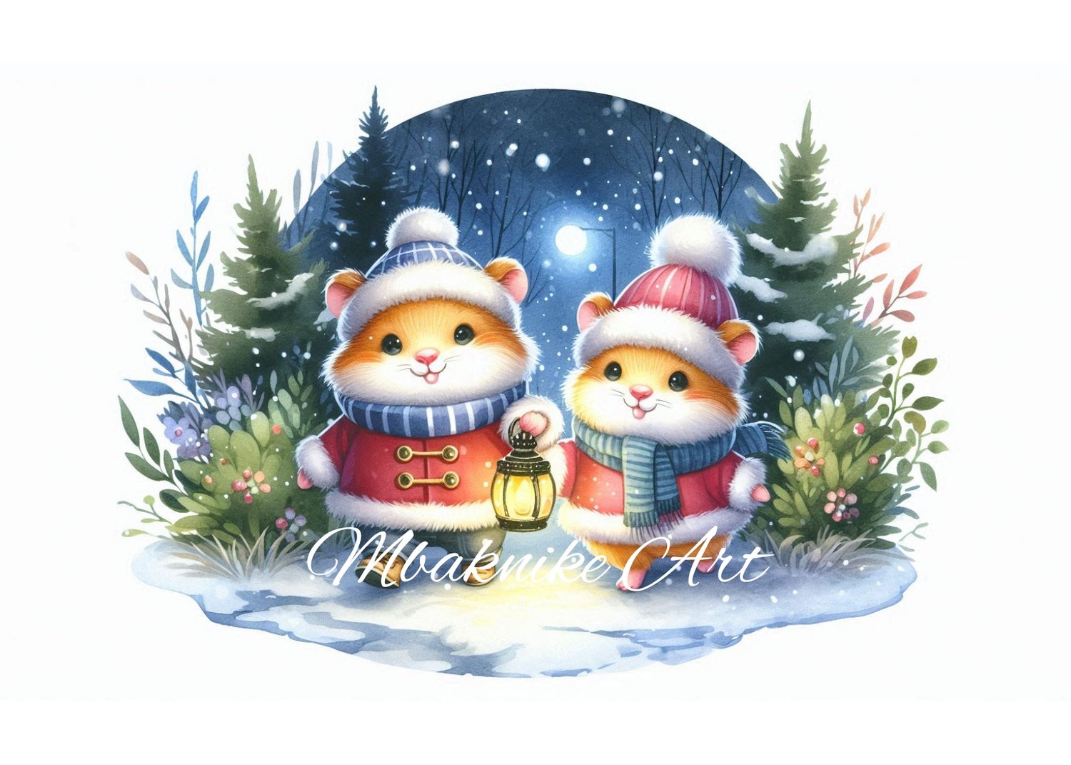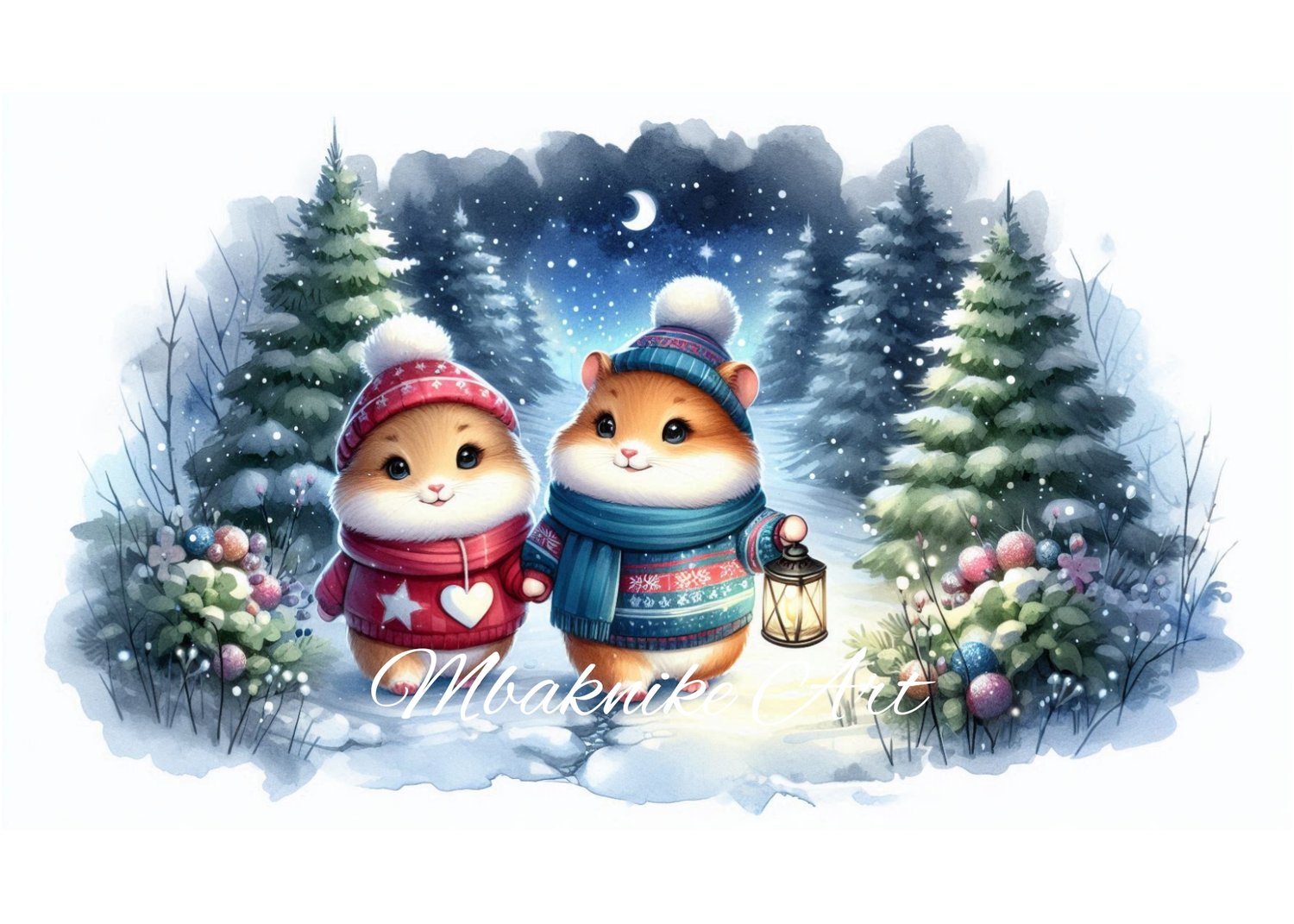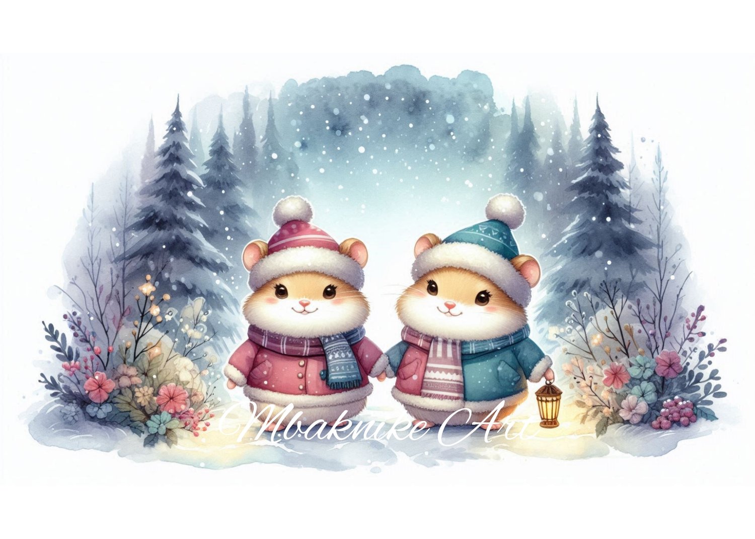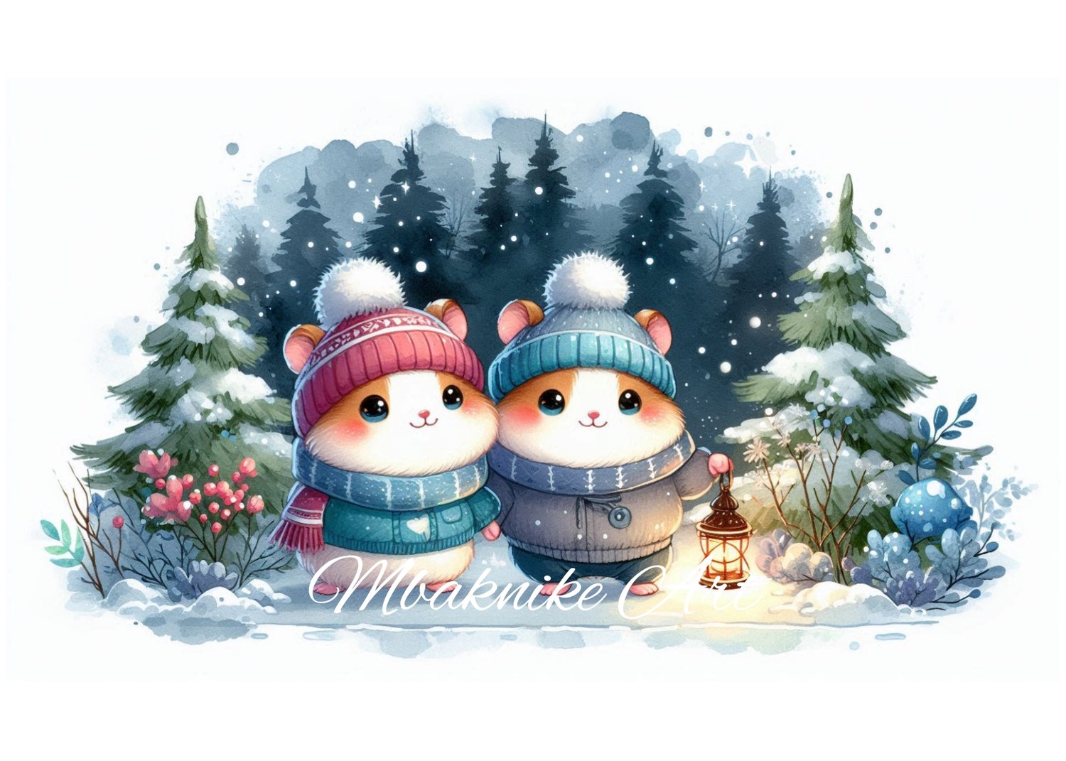 Transform your creative projects with our "Winter Couple Hamster Clipart" collection! This digital pack includes 20 unique and whimsical images, each in JPG Format at a high resolution of 300 dpi and 3500x2500 px.