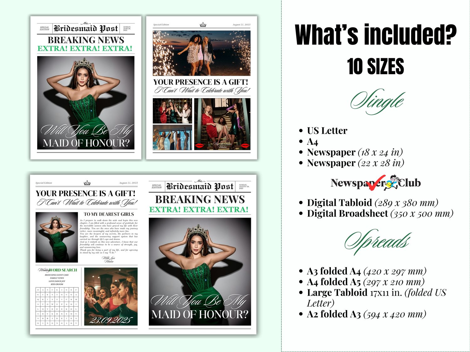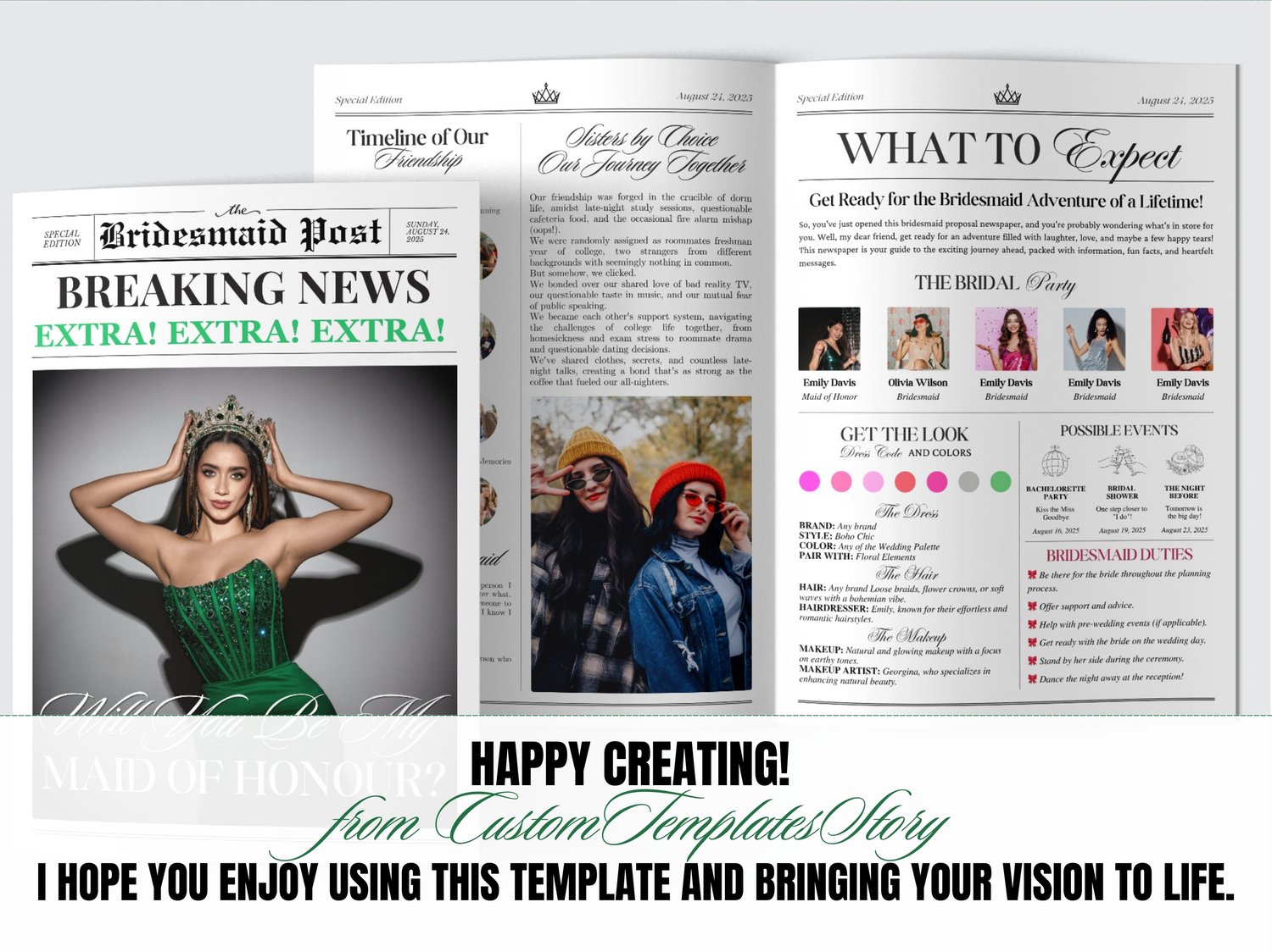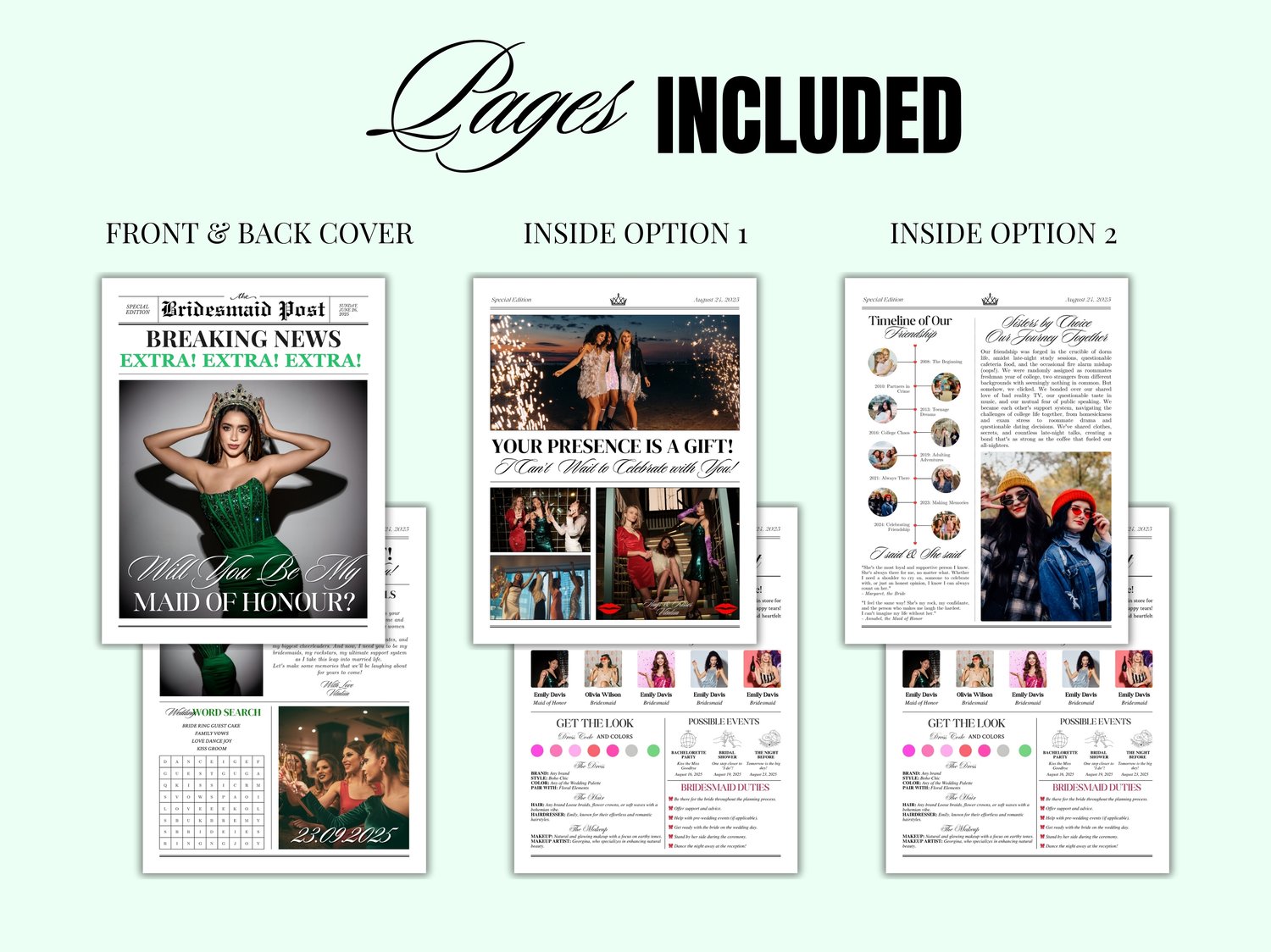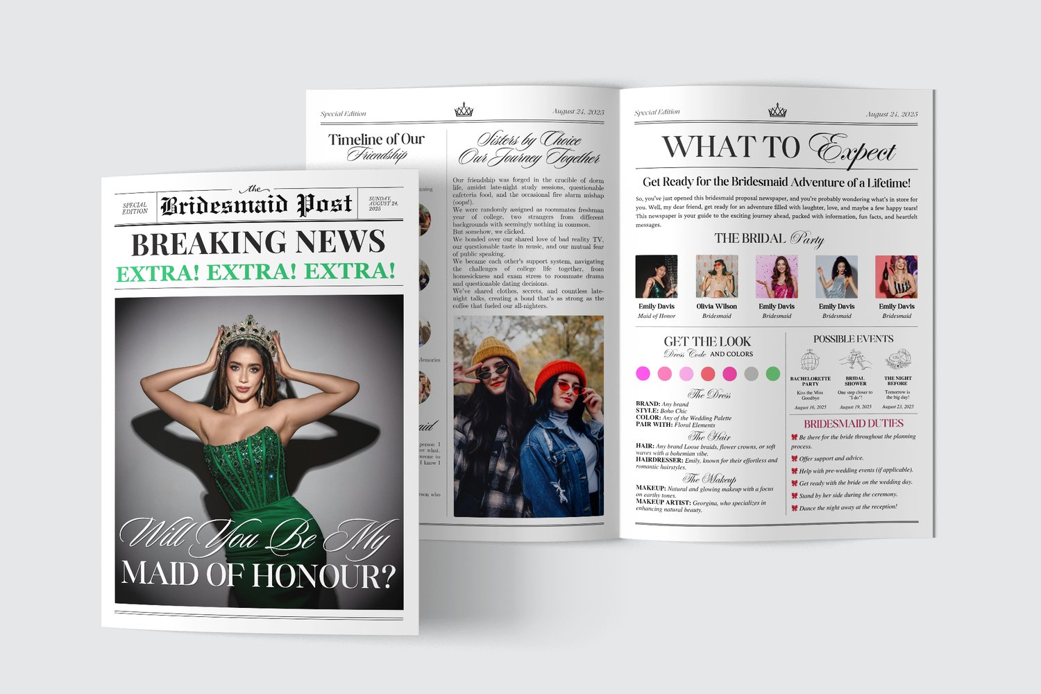 Our Bridesmaid Newspaper Proposal is a high-quality Canva Template, ensuring a beautiful presentation that your friends will cherish forever. It's not just a card; it's a memorable keepsake that captures the excitement of your upcoming wedding. To complement your proposal, consider adding a Bridesmaid Info Card that contains all the essential details your friends will need as they prepare for the big day.