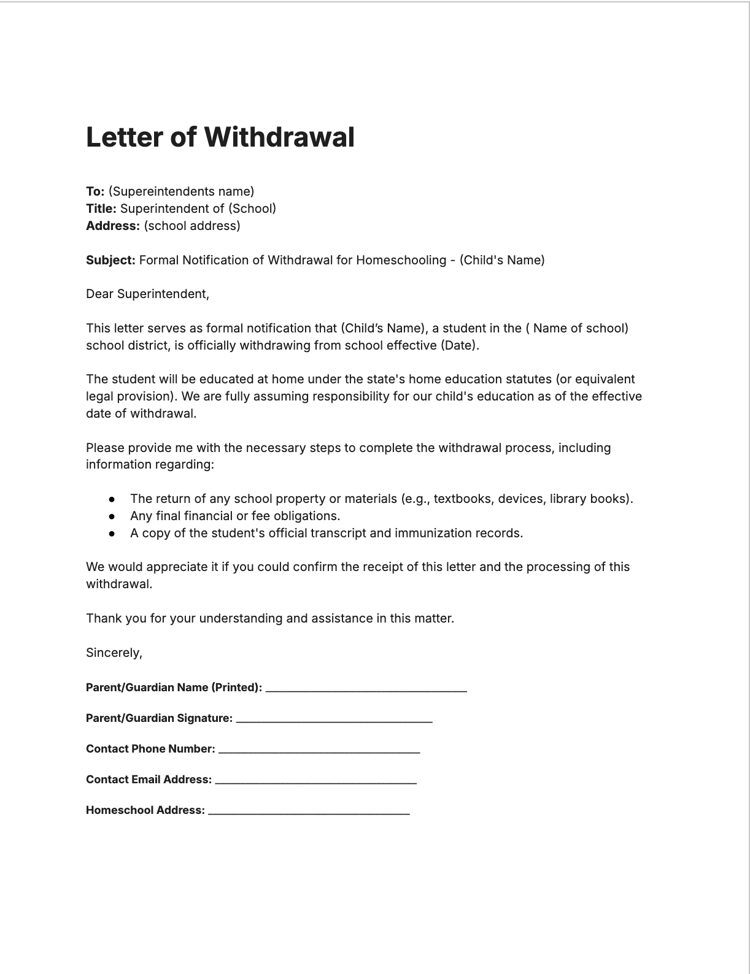 - Formal Withdrawal Template: A clean, professional letter to officially notify your current school that you are transitioning to homeschooling.