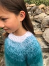 This top-down yoke sweater has a bulky fit and falls below the natural waist. It is a quick knit that relies on common techniques for an easy-level project, however holding four strands together increases the difficulty.