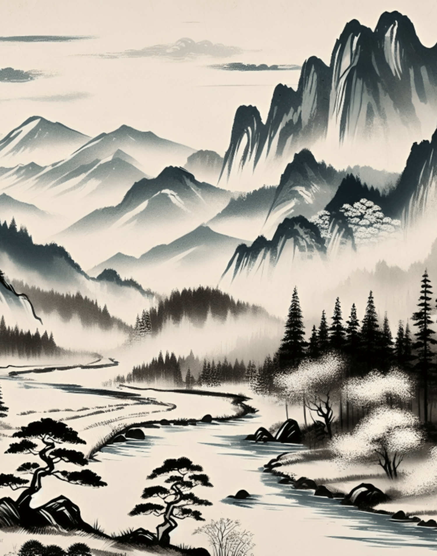 Japanese Ink Style Painting, River, Mountain, Vintage Village, Top Art, Nostalgic Rural life, Nature, Cool Nature, Beautiful Nature, Sunrise, Natural Landscape, Wall Art, Digital Art.