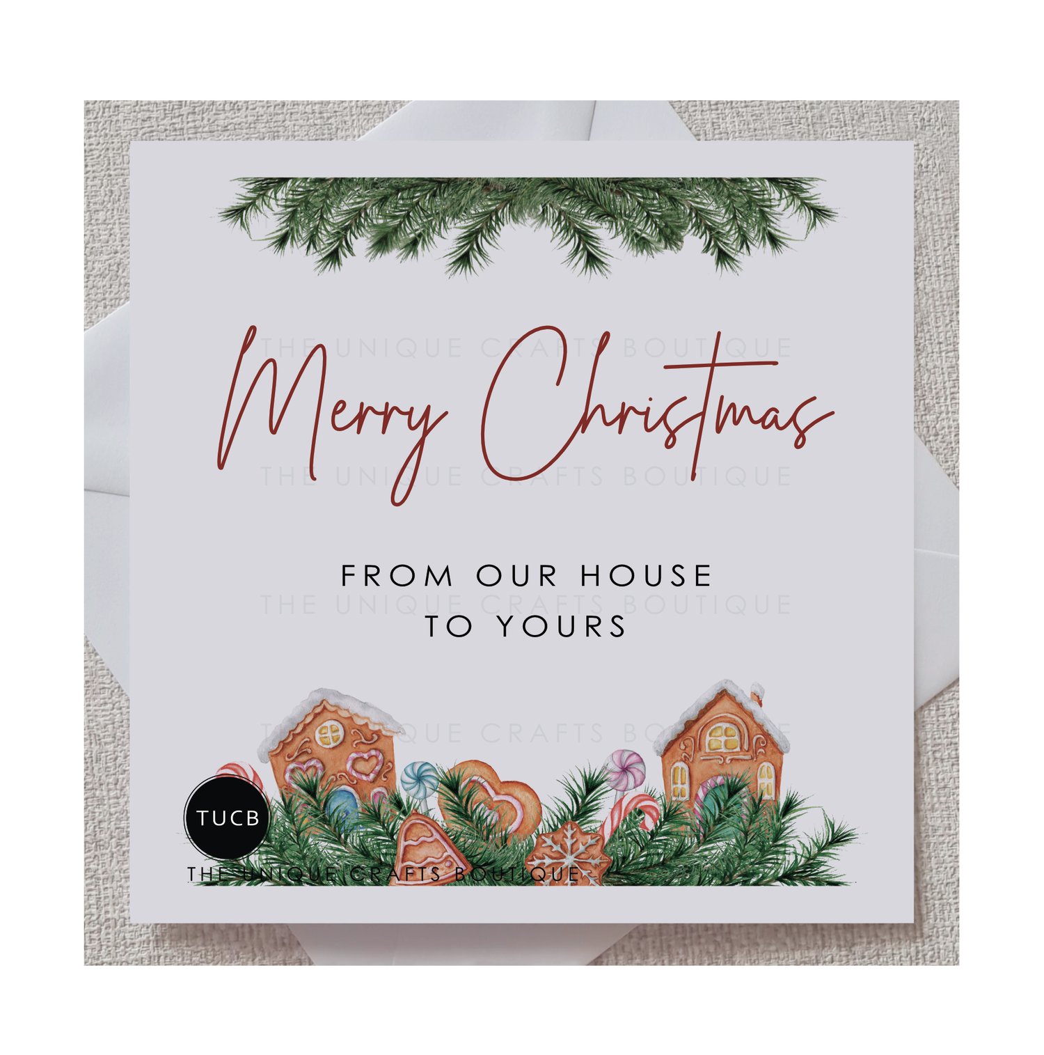 Printed with 2 hand-drawn Gingerbread houses surrounded by festive branches and Christmas Cookies with the greeting 'Merry Christmas from our house to yours' displayed above.