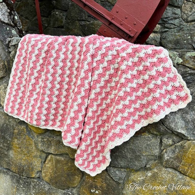 The pattern includes 8 sizes: Stroller, Receiving, Toddler, Lapghan, Throw, Twin, Queen, and King. I’ve also included tips to help you easily customize the size to fit your needs.