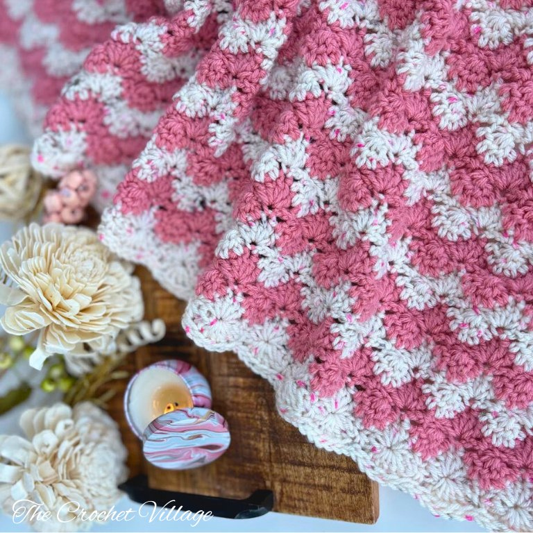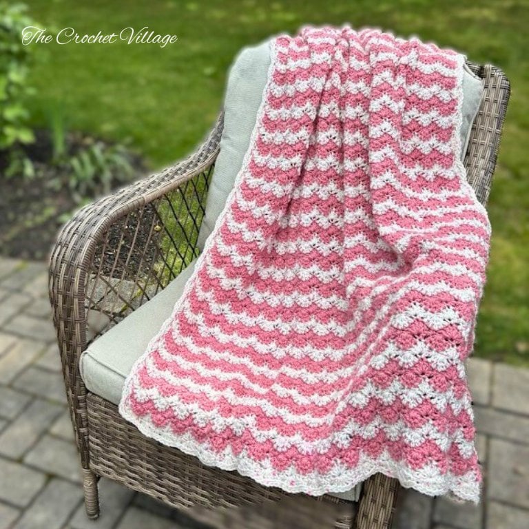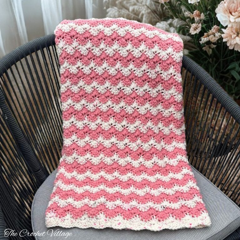 Finished with a delicate shell border that adds just the right touch, this blanket is both simple and elegant.