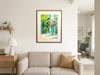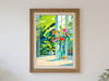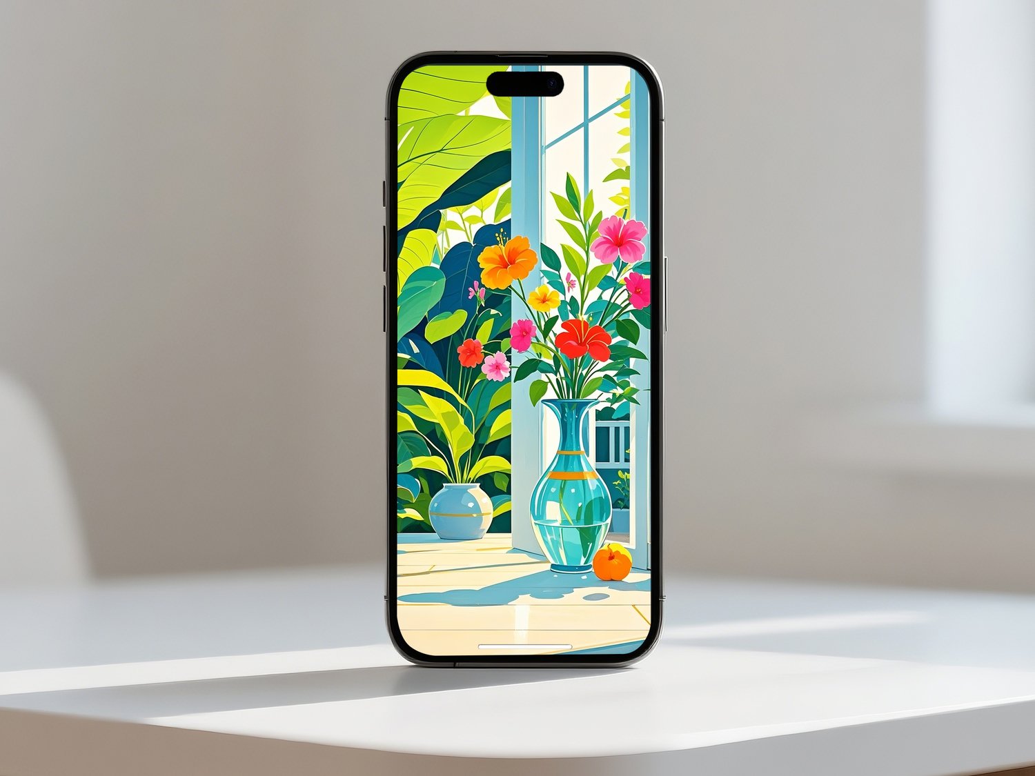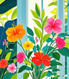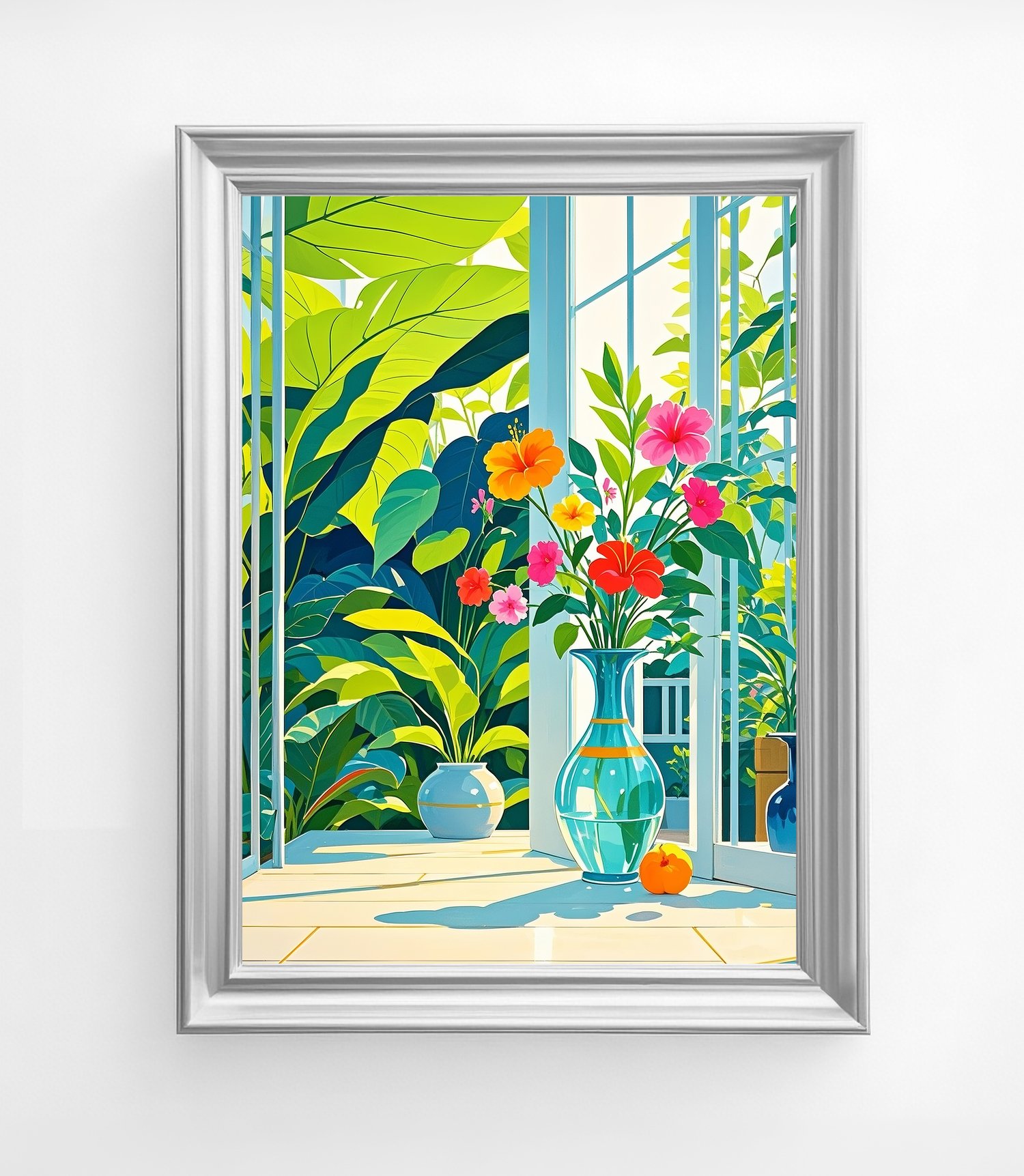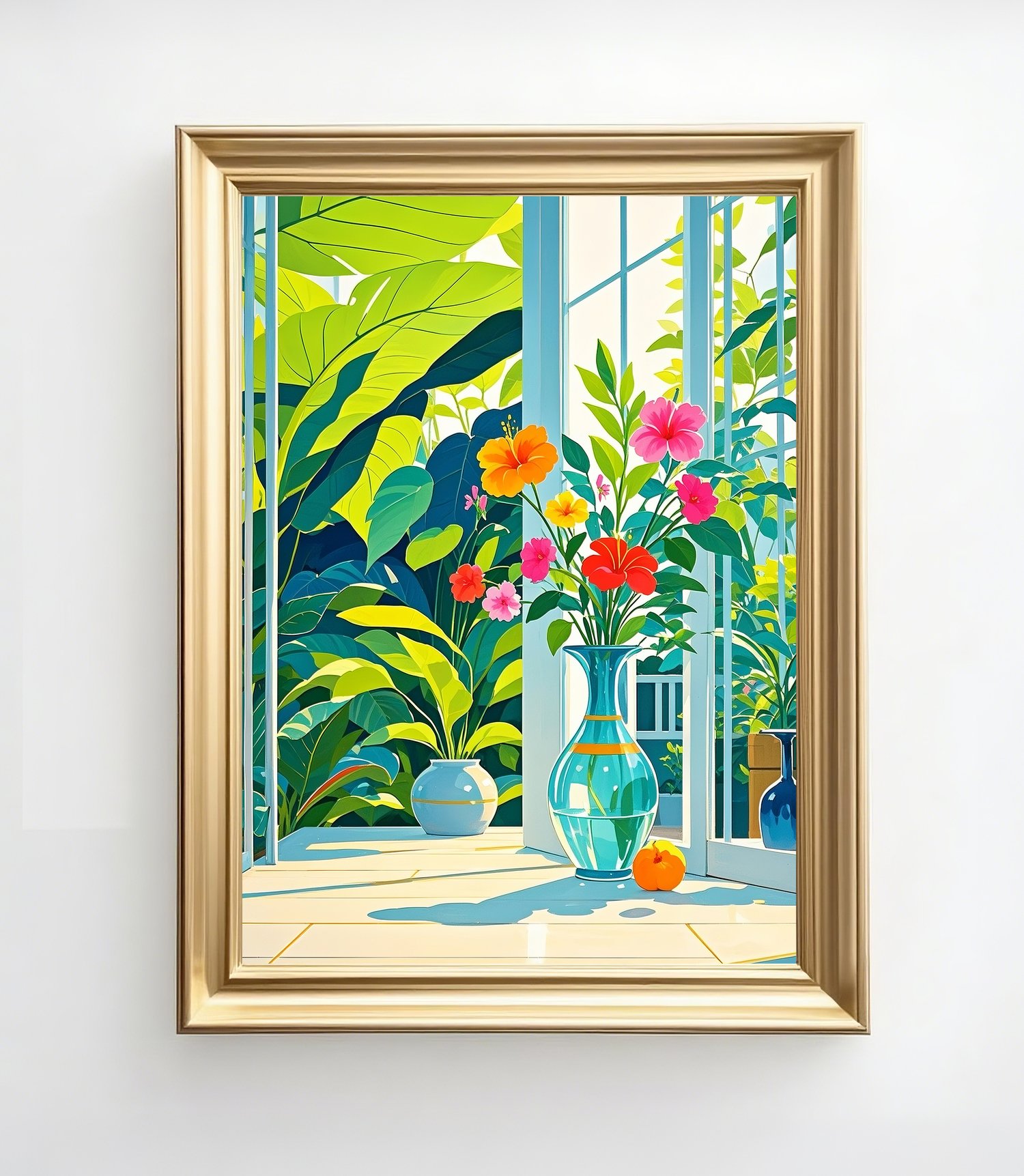 This artwork radiates a refreshing and uplifting atmosphere. The composition effectively balances the lush greenery in the background with the vibrant bouquet of flowers in the glass vase at the center. The interplay of sunlight, reflected on the tiled floor and glass surfaces, creates a sense of warmth and tranquility, suggesting an inviting indoor garden or conservatory scene. The bold use of bright colors—especially the vivid greens, oranges, reds, and pinks—contributes to a cheerful, almost tropical feeling. The details, such as the small orange fruit on the floor and the carefully drawn reflections on the vase, add depth and liveliness. Overall, this piece combines clarity, harmony, and vibrancy in a way that makes it visually soothing while also stimulating. It could be appreciated both as decorative art and as an expression of vitality and serenity.