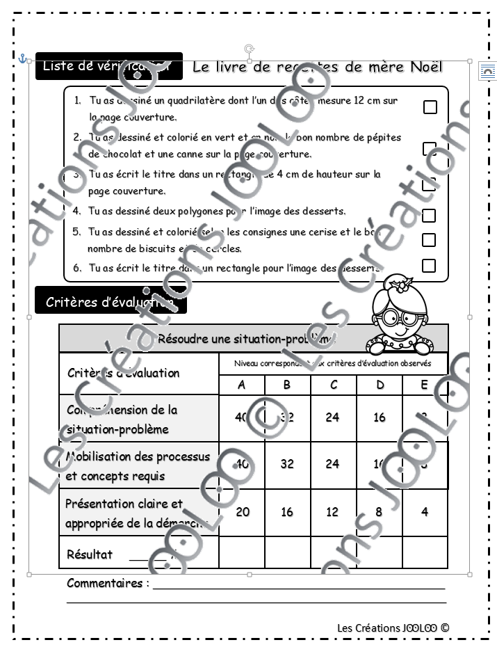 - 1 feuille de vérification pour l'élève incluant une partie pour la pondération par l'enseignant