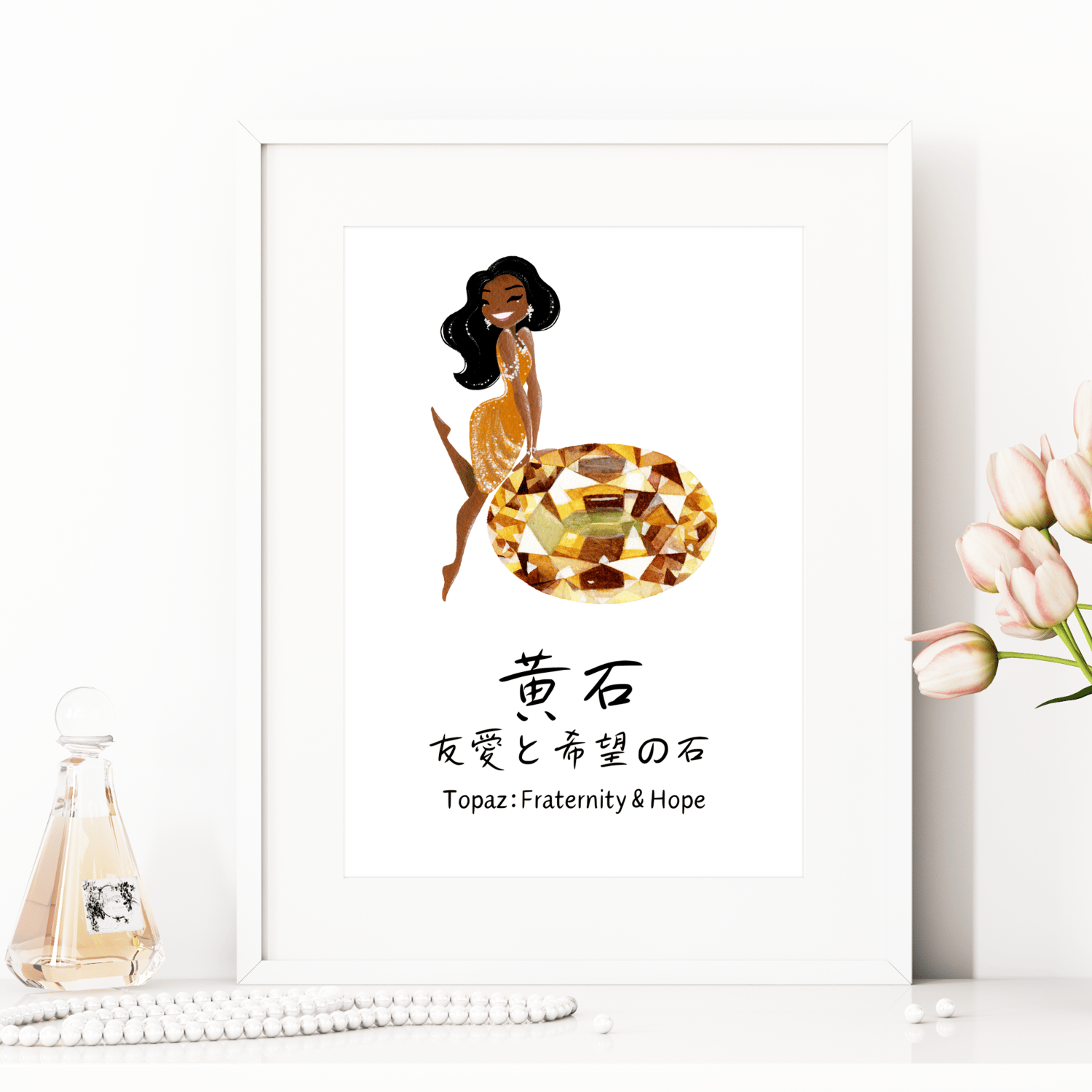 This beautifully illustrated wall art features the November birthstone, Topaz, in a stylish depiction of a sophisticated woman. The illustration includes meaningful quotes about Topaz's significance, written in both English and Japanese. Printed on high-quality 10.3 mil (0.26 mm) thick matte paper, this museum-quality poster is designed to add a touch of elegance to any room. The vibrant yellow hues of the Topaz illustration bring a cheerful and positive atmosphere.