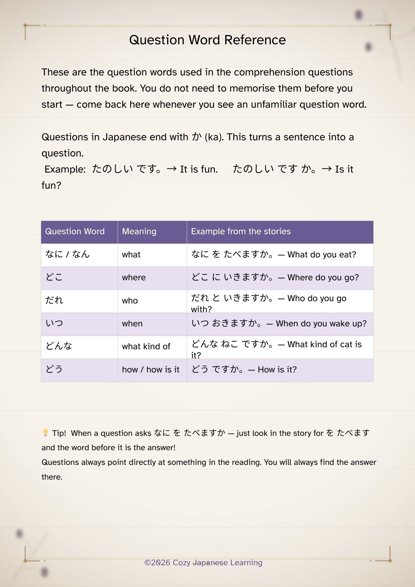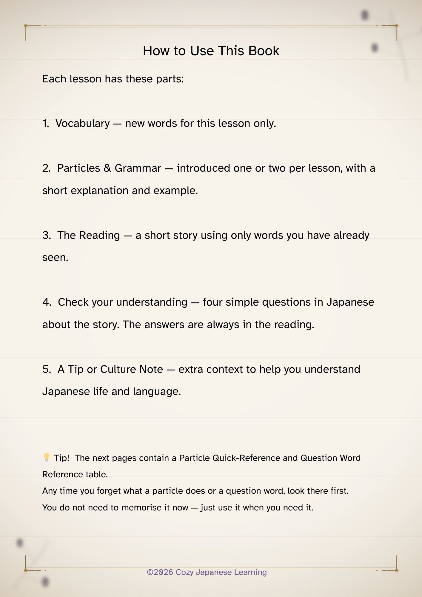 Each of the 10 lessons follows a calm, structured rhythm designed to build your reading ability gradually and naturally. First, a small vocabulary list introduces only the new words for that lesson — nothing extra, nothing unnecessary. Then one or two grammar points are explained clearly with simple examples. After that comes the reading: a short, natural story using only words you've already seen.