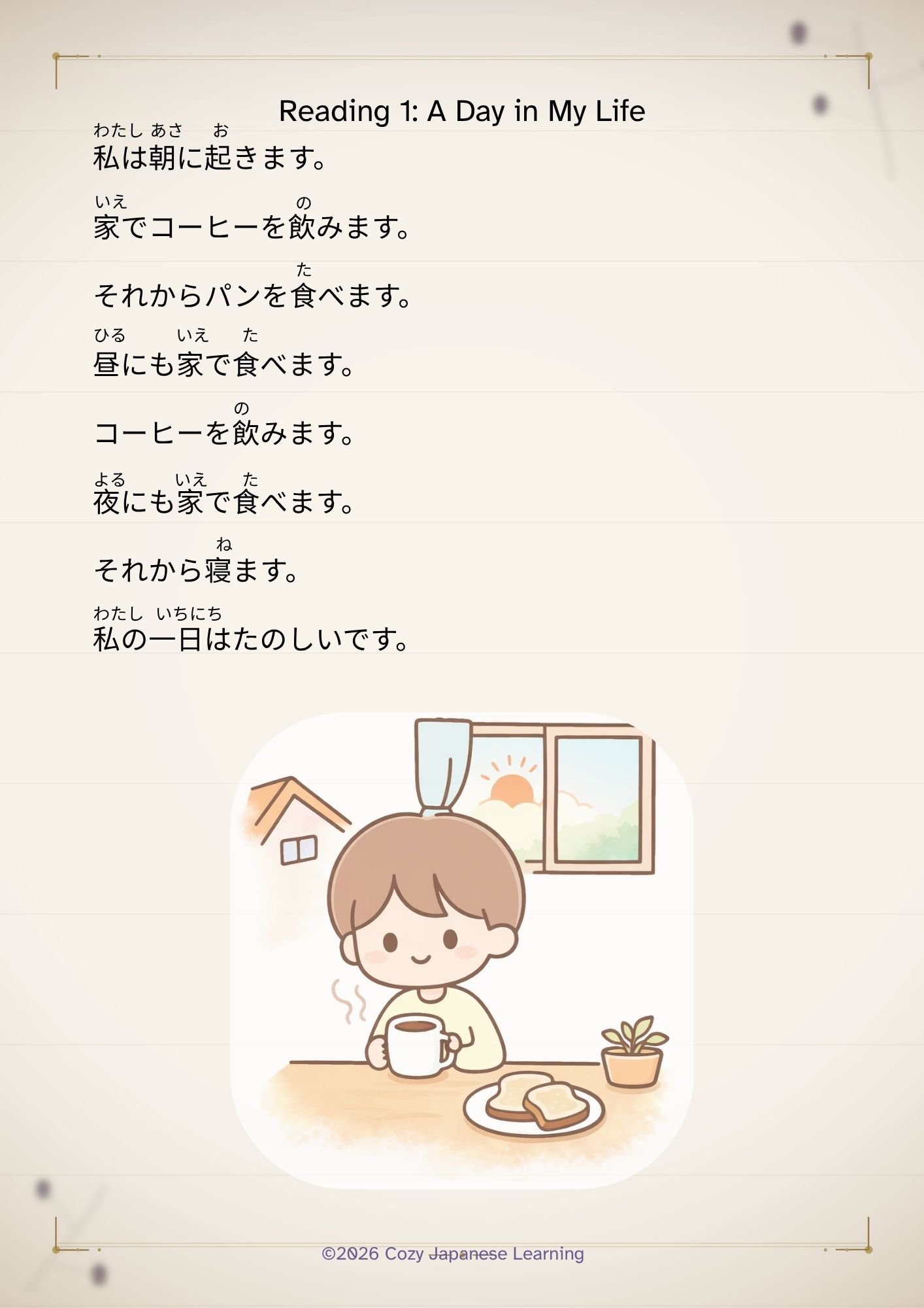 A Beginner Japanese Reading Book with Furigana & N5 Kanji Introduction | 10 Lessons + 2 Review Stories | PDF eBook