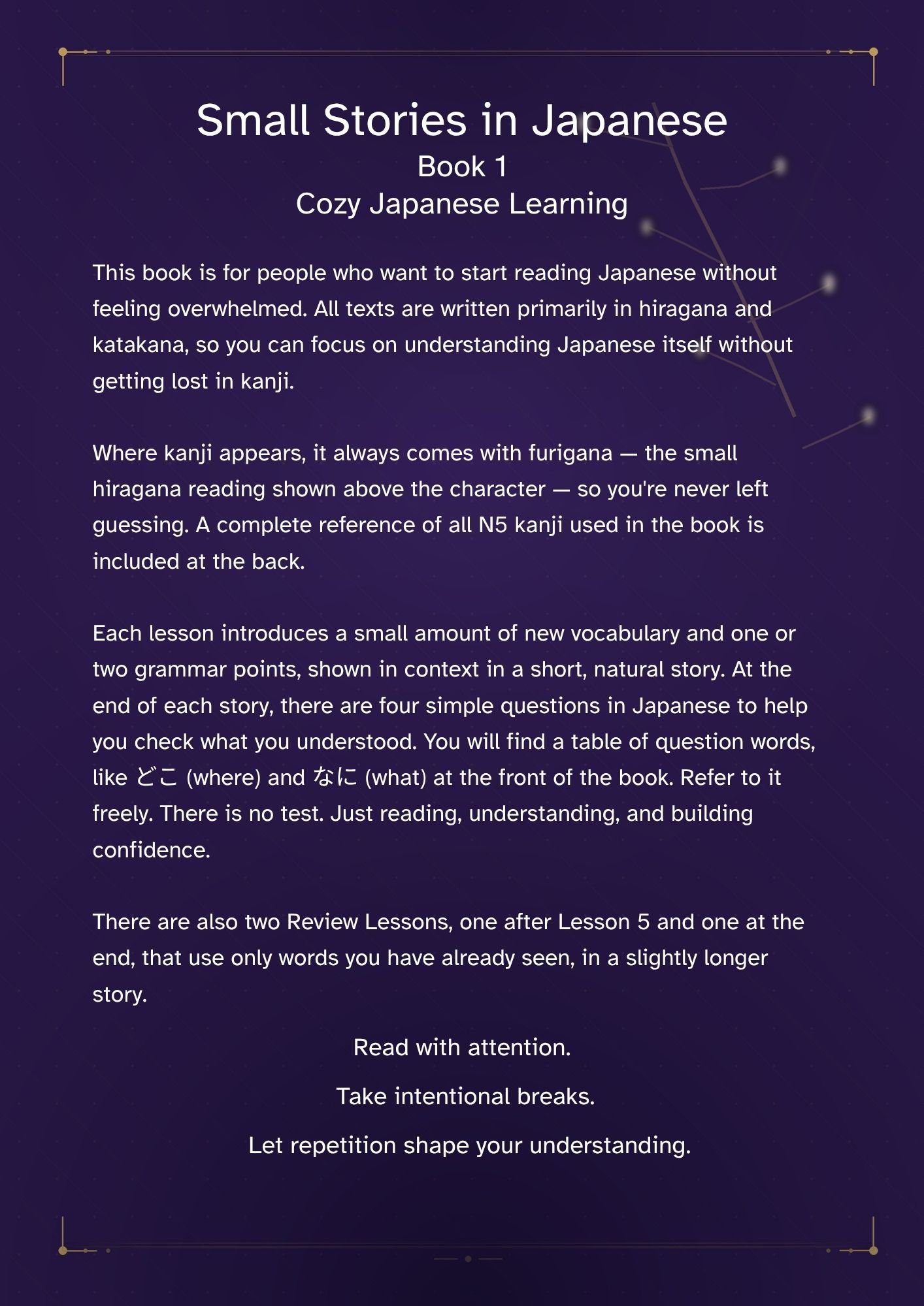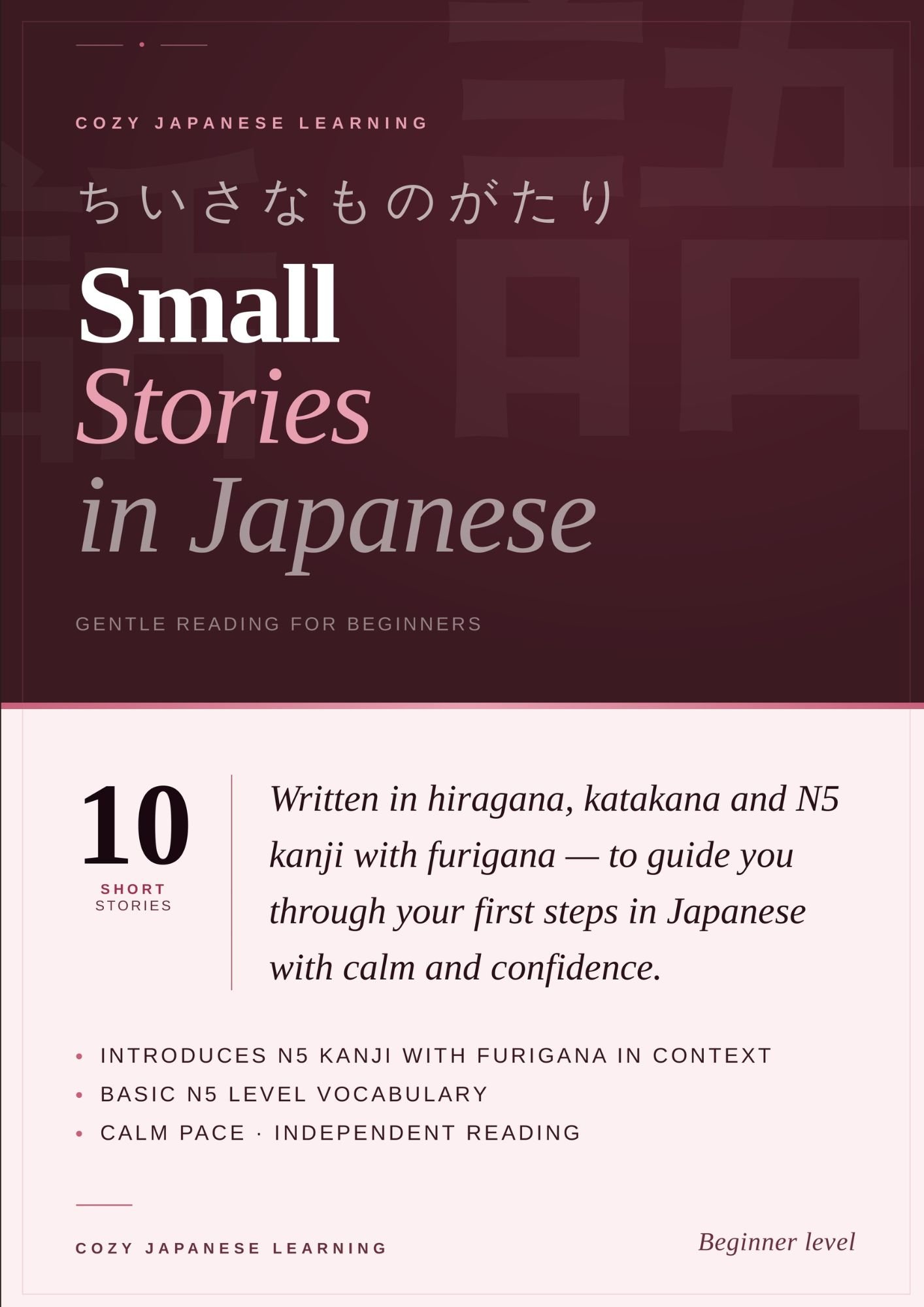This is exactly the book for that moment. Small Stories in Japanese is for the beginner who knows the kana and is ready to start reading real Japanese — but wants something gentle, well-supported, and actually enjoyable. Not a textbook that throws everything at you at once. Not an app that gamifies what should be a calm, focused practice. Just real Japanese reading, with just enough kanji to start feeling like you're moving forward.