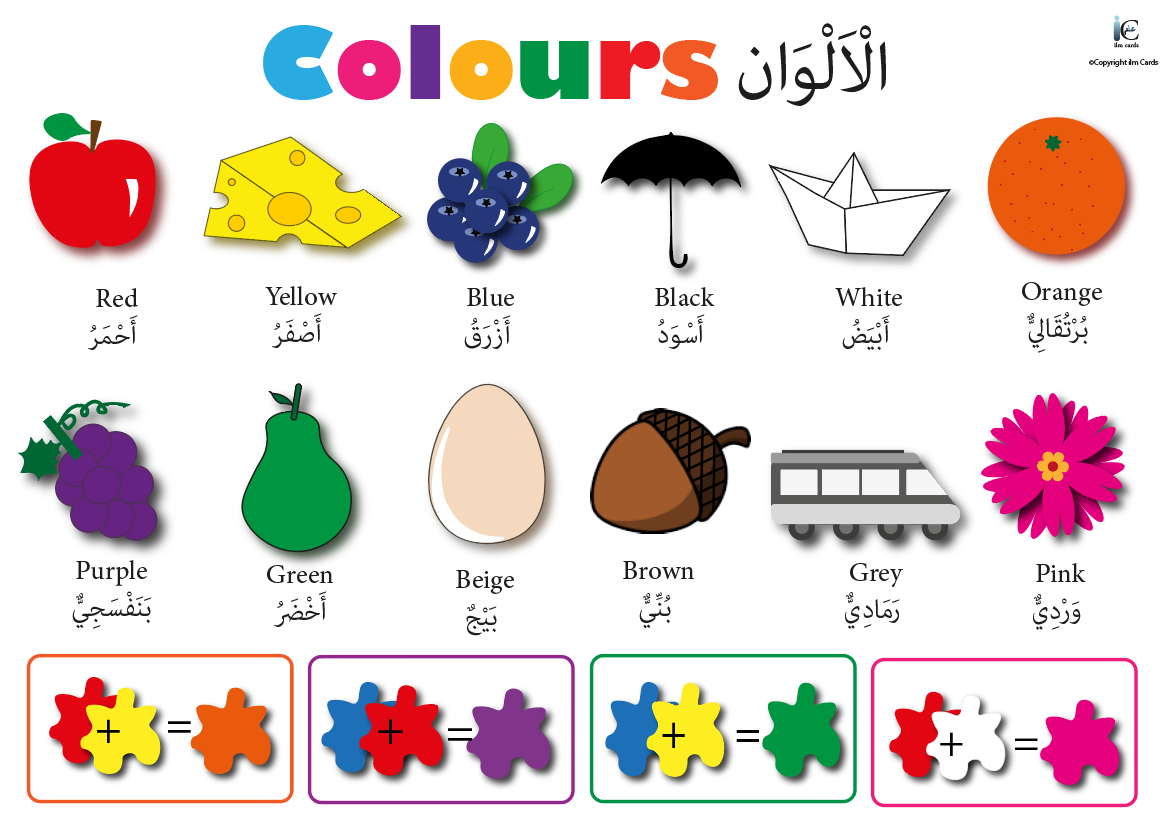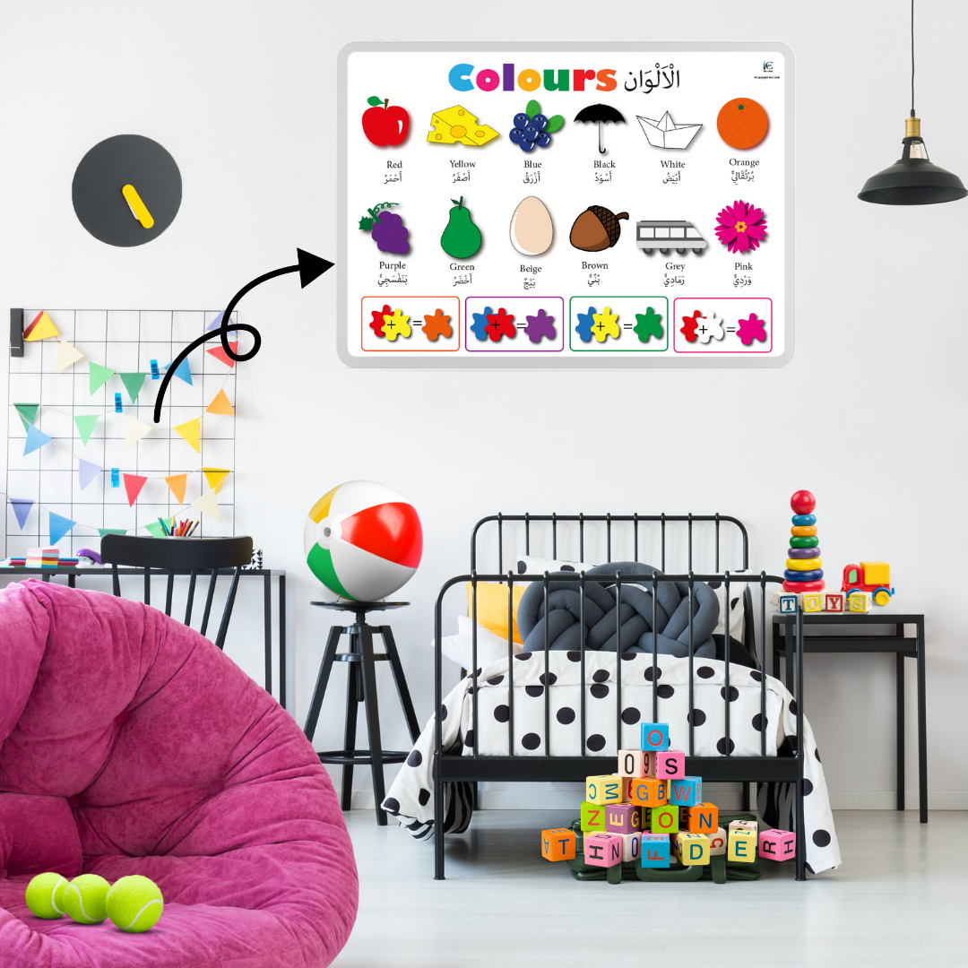 Our colourful Arabic colour's poster is perfect for your child’s room. It comes with illustrated pictures to engage your child in learning colours in Arabic.