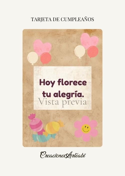 Esta tarjeta celebra el instante luminoso en que la alegría florece como un jardín en primavera. Sobre un fondo cálido en tonos beige, se elevan globos de colores y decoraciones festivas que envuelven el mensaje central con ternura y celebración. La frase "Hoy florece tu alegría" se presenta como un deseo suave y profundo, ideal para acompañar el cumpleaños de alguien especial con un gesto delicado y lleno de luz.