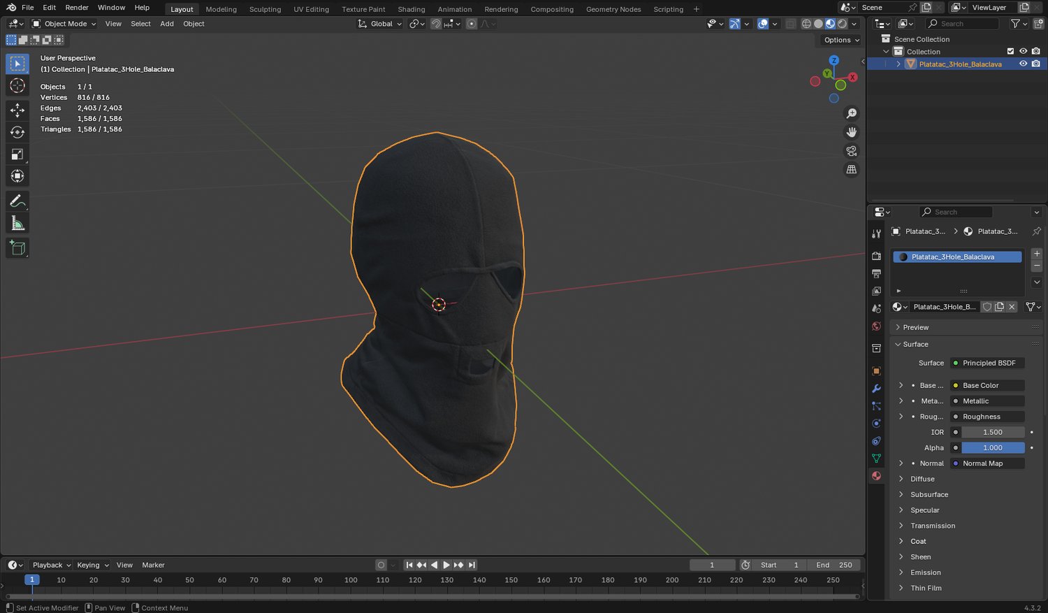 Game-ready 3D model of the Platatac 3 Hole "Spook" Balaclava. Great for games such as Arma 3, DayZ, Reforger, Ready or Not, etc. This model was made with care and with easy rigging in mind demonstrated by the grid-like topology.