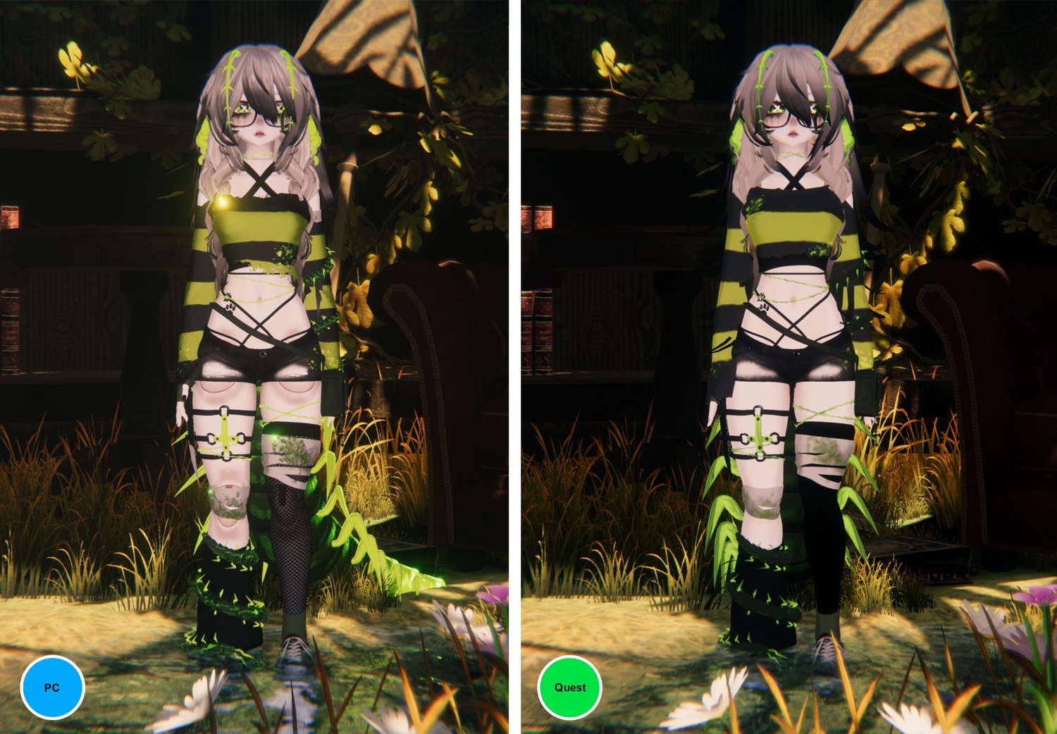 Quest Notes: All SFX, Outlines, Rainbow mode, Centipede flow toys, Coffin, Sclera / doll joints / Makeup, Inner heart, and Hair Brush Functions (SFX, Pickup, Contacts // Hair brush still toggleable) are removed for quest due to incompatibility.