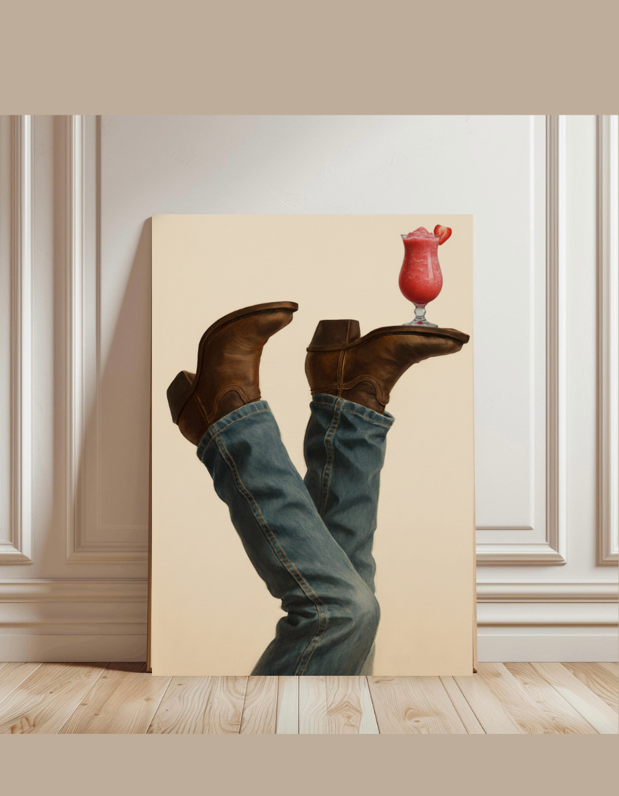 Elevate your space with this hilarious and trendy cowgirl art featuring upside-down cowgirl boots in jeans balancing a vibrant strawberry daiquiri cocktail on top! This wall art printable PNG is perfect for adding a fun, western twist to your home, bar, or office decor. Ideal for fans of western decor, cocktail print enthusiasts, and anyone seeking unique digital print wall hangings.