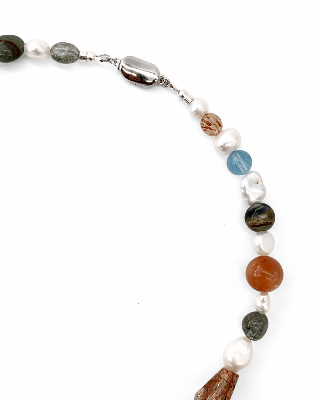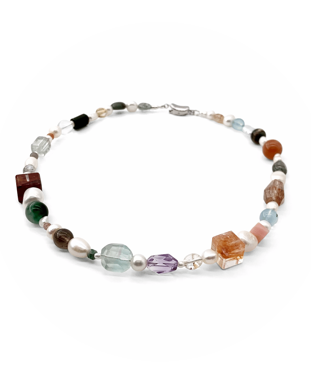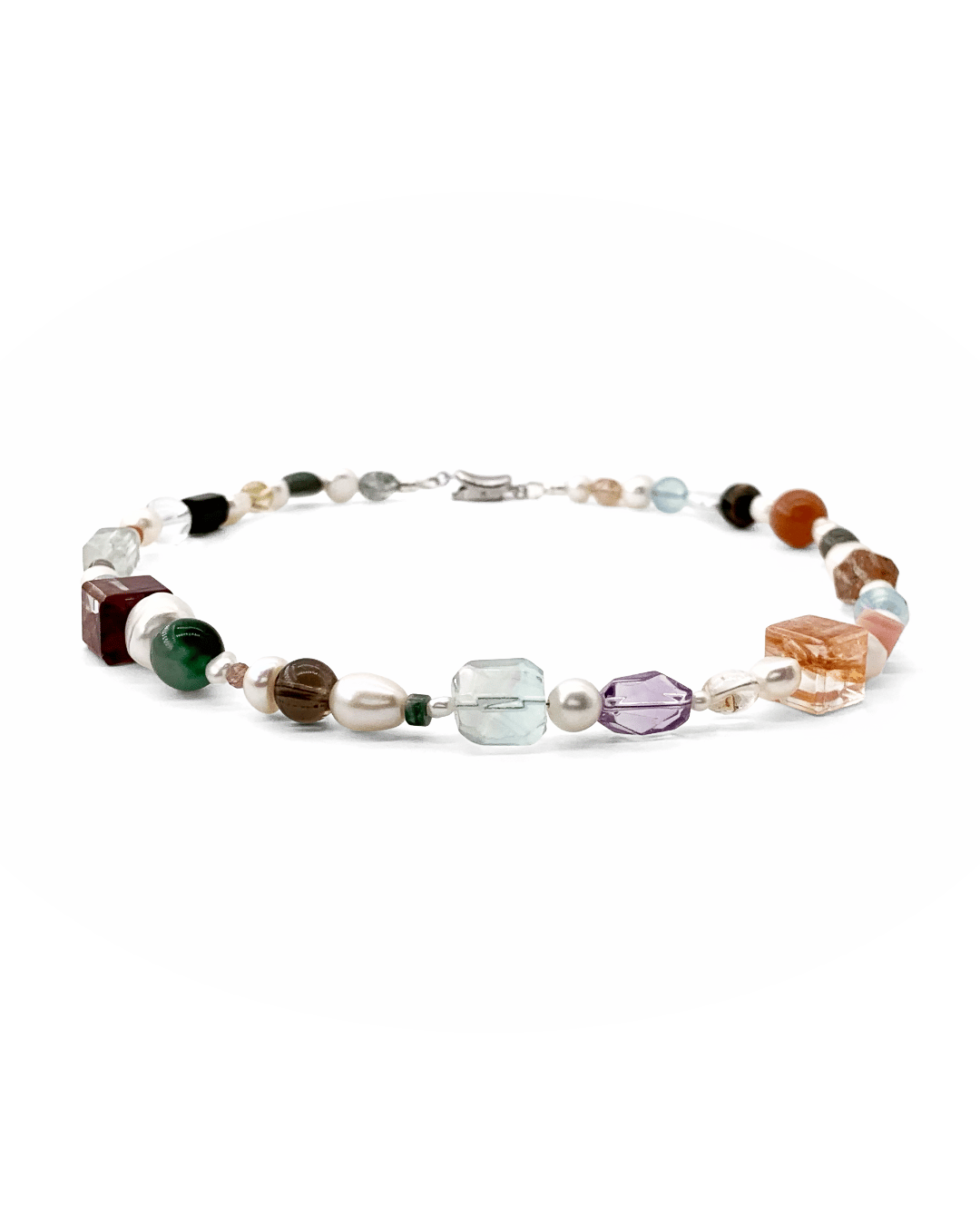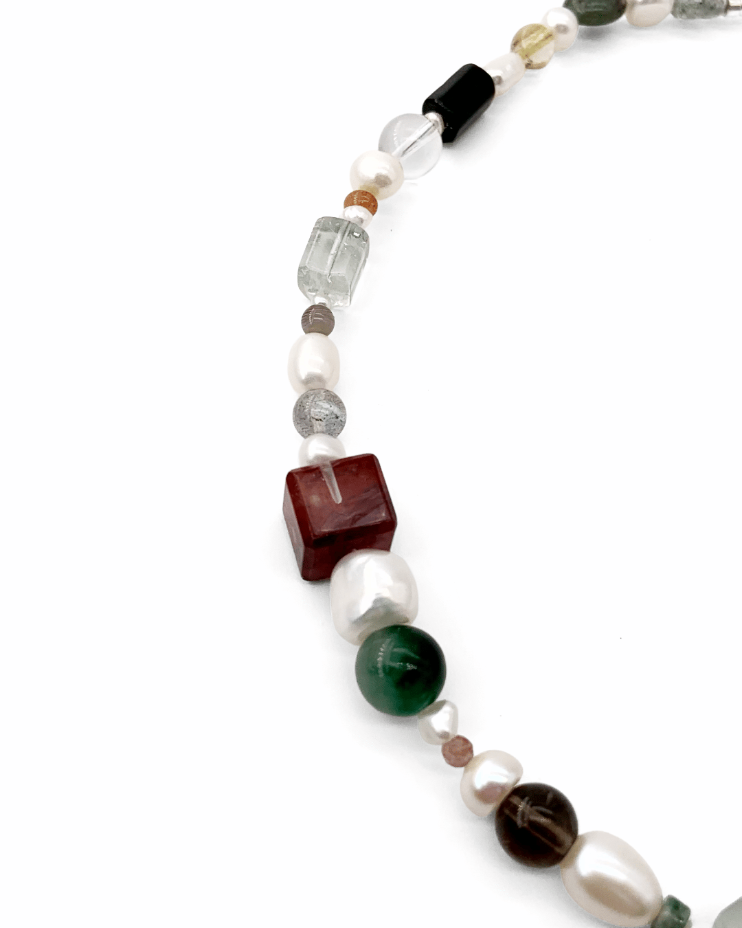 Centered around crystals and paired with pearls of varying sizes and shapes, each crystal reveals its own unique cut and hue. Their interwoven arrangement creates a natural and irregular beauty.