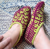 The Ciabattas are knitted using the mosaic knitting technique in garter stitch. The slippers are worked from the toe up. The toe is worked in rounds, and the sole and the heel are worked flat.