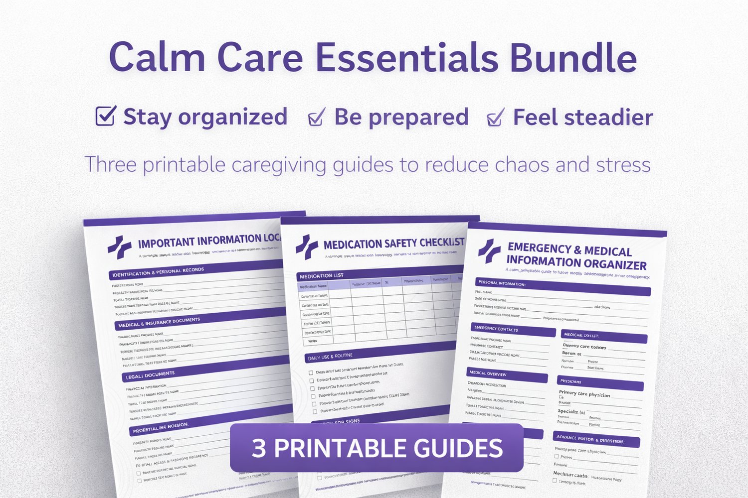 The Calm Care Essentials Bundle includes three practical, printable guides designed to help families prepare ahead of time — without panic, medical jargon, or overwhelm.