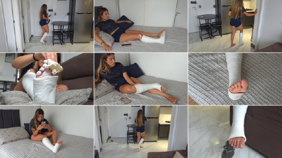 Amy ist gerade aus dem Krankenhaus nach Hause gekommen, mit einem eingegipsten Fuß und ohne Krücken. Deshalb erledigt sie alle Aufgaben, indem sie auf einem Bein hüpft. Der Gips ist noch frisch, und ihre Zehen sind mit Gips bedeckt, also nimmt sie ein Tuch und wischt sie vorsichtig sauber.