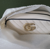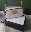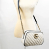 Gucci GG Marmont Leather Cross Body Bag. This stylish handbag is crafted of soft calfskin leather in off white with a diagonal quilt and navy blue leather accents. This shoulder bag features an aged gold chain and leather shoulder strap with a textured gold Gucci GG logo on the front.