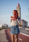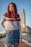 Tricotada de cima para baixo em ponto mousse, sem costuras e com carreiras encurtadas a formar as riscas.