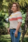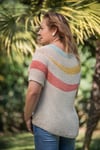 Seda is an incredibly lightweight summer tee. It features an asymmetrical yet totally balanced design. The stripes are enhanced by the neutral background and by half brioche stitch.