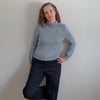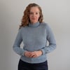 Cold Shoulder is a top down pullover. The shoulder saddles are knit first and then the stitches are put on hold. The fronts and backs are picked up from the edges of the shoulder saddle, and the sleeves are knit across the saddle stitches previously put on hold. Short rows are used to complete the shoulder shaping for the front and back. The yoke is worked in the round. The sleeve stitches are put on hold while the underarm stitches are cast on. The body is continued in the round down to the hem ribbing. The sleeves are returned to the needles, and knit from the underarm down to the cuff. The turtleneck collar is picked up from the neckline edge.