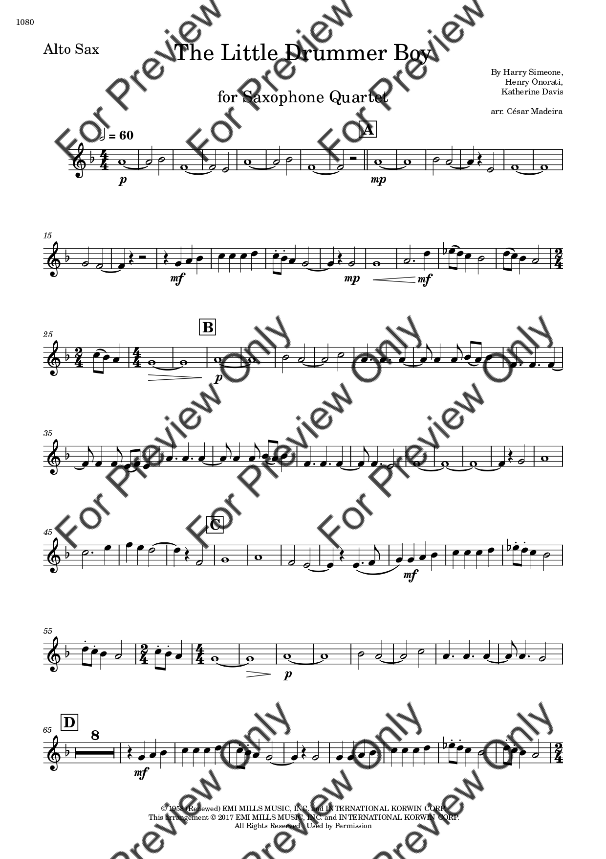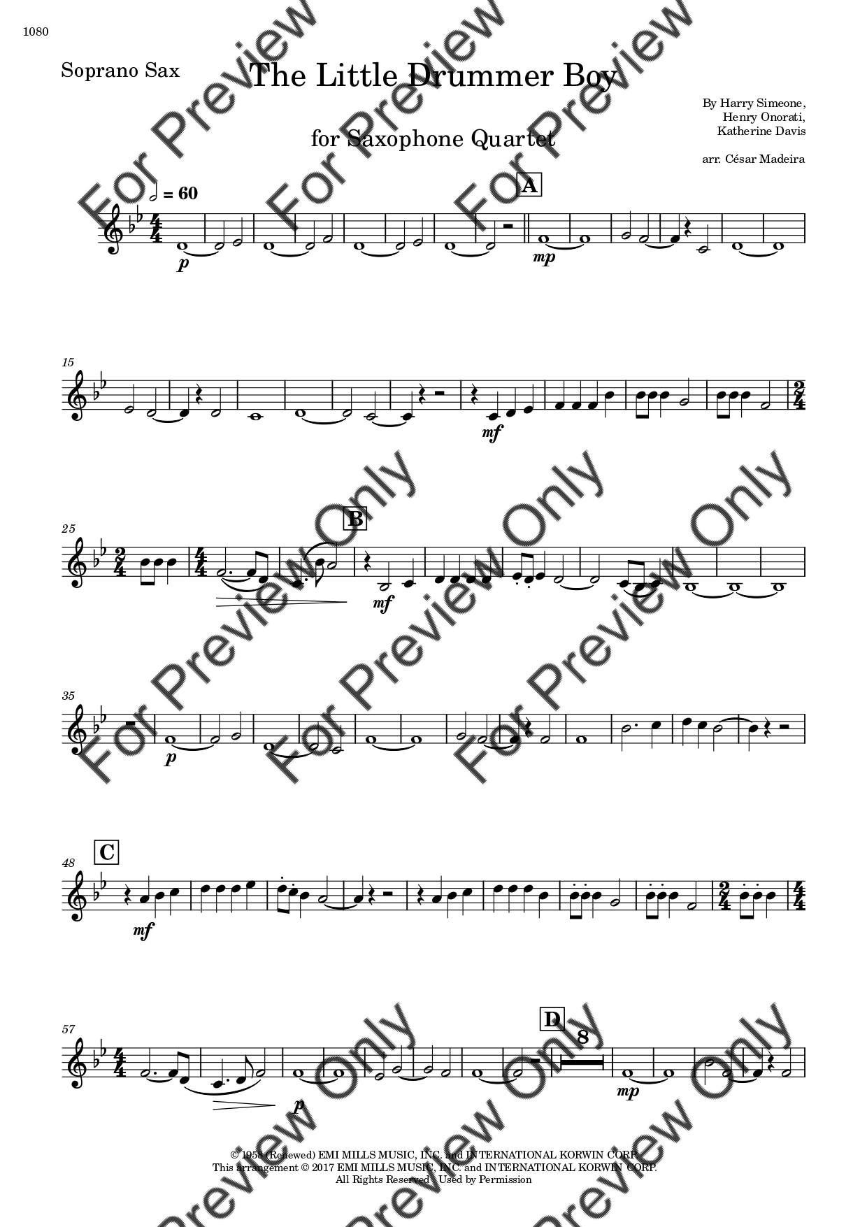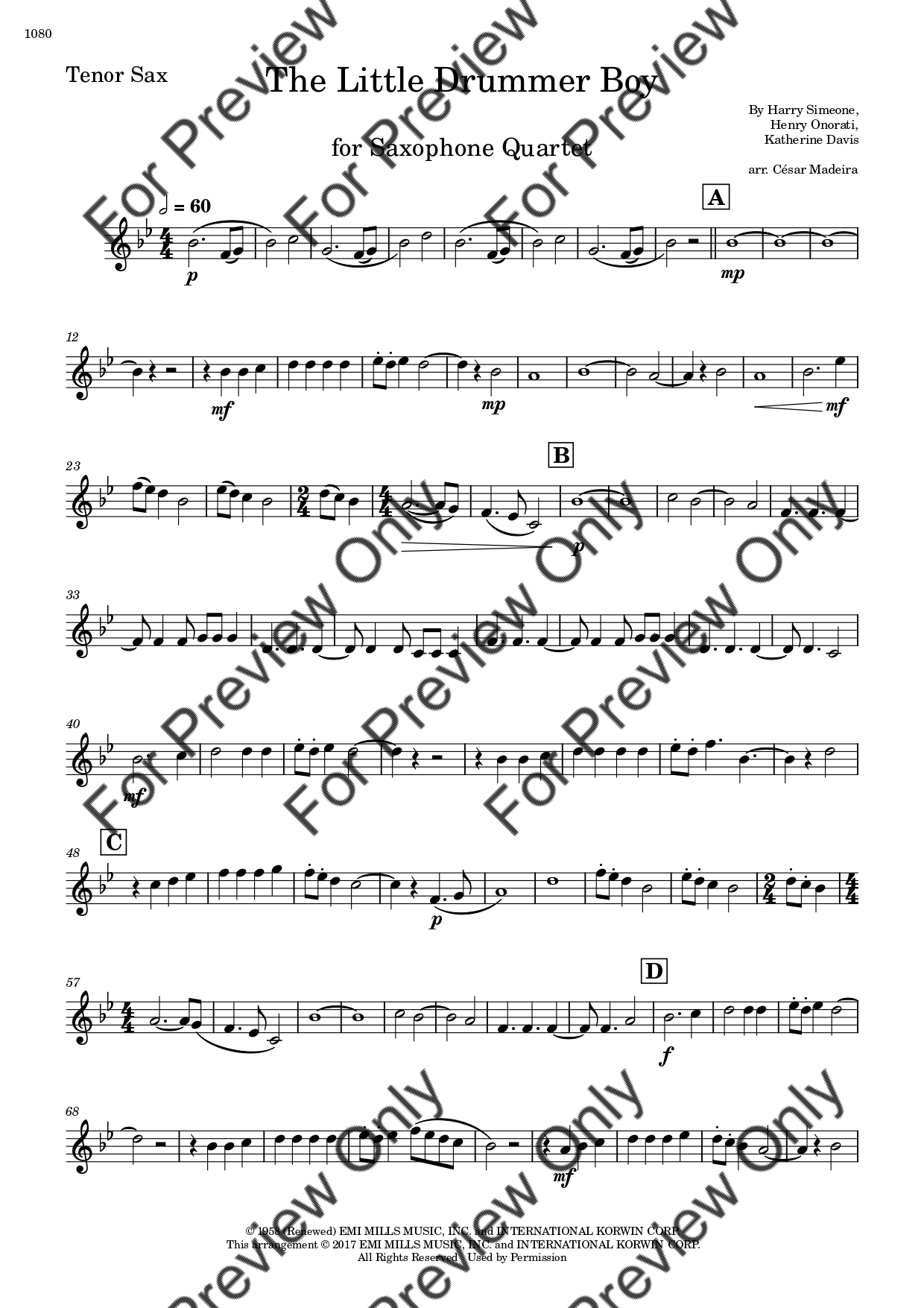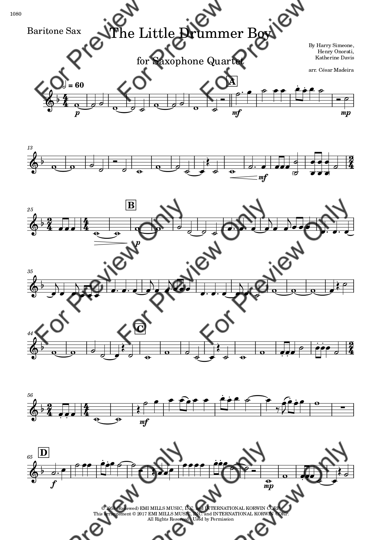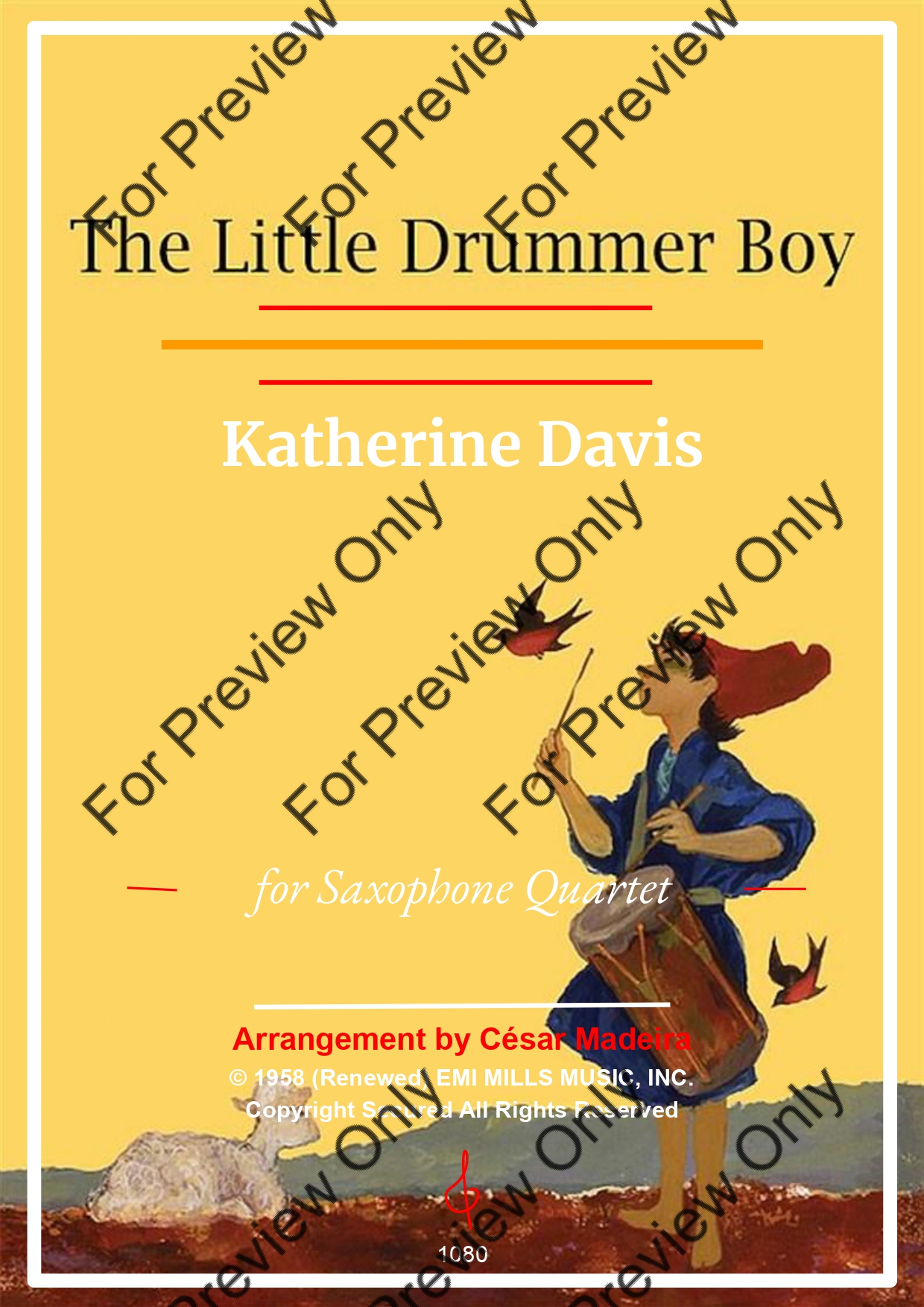 The Little Drummer Boy. Arrangement for Saxophone Quartet - Soprano Sax, Alto Sax, Tenor Sax and Baritone Sax. With Full Score and Individual Parts. Have fun!