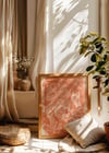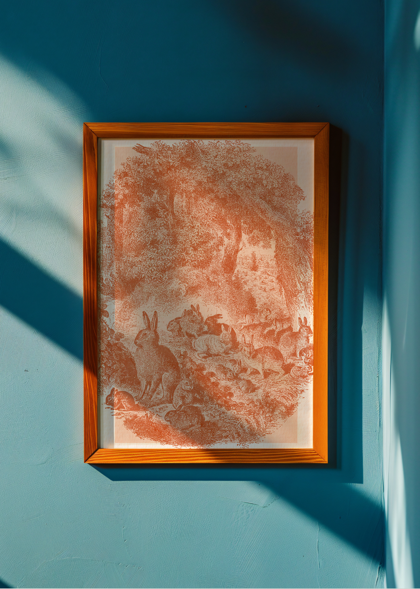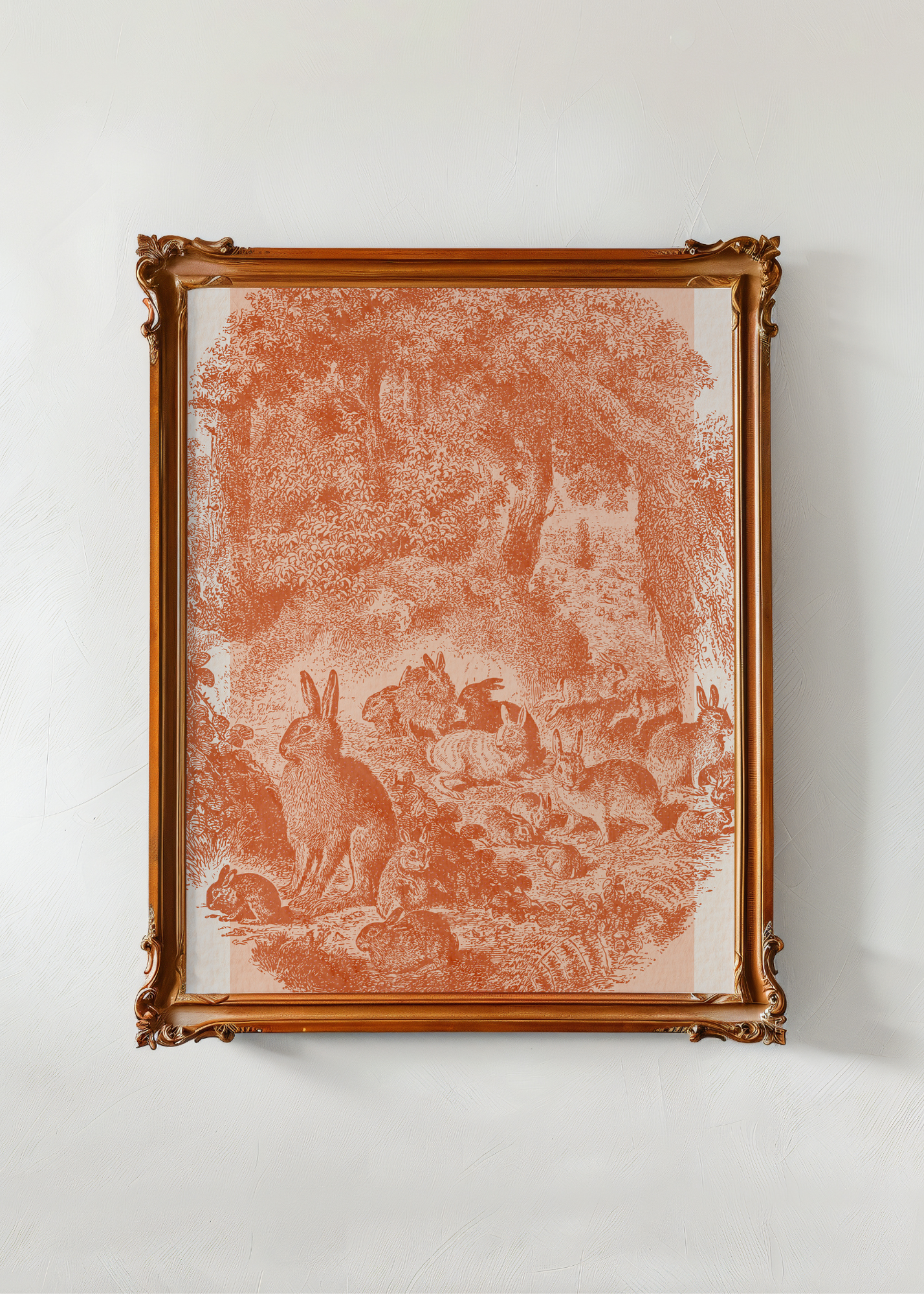 Softly in the Thicket— Tucked into a dreamy blush-pink woodland scene, a group of cozy little bunnies laze beneath branches and brush. The entire vintage-style print is washed in a soft, muted pink, giving it that timeless, storybook charm. It’s gentle, nostalgic, and made for slow mornings and warm-hearted corners.