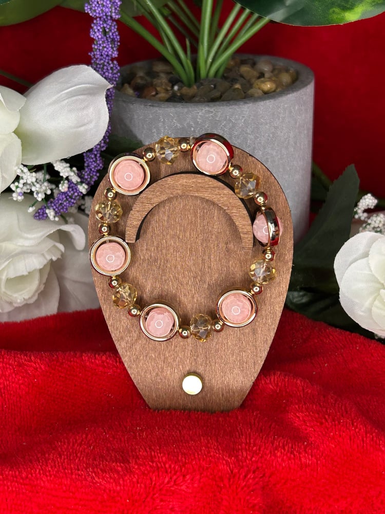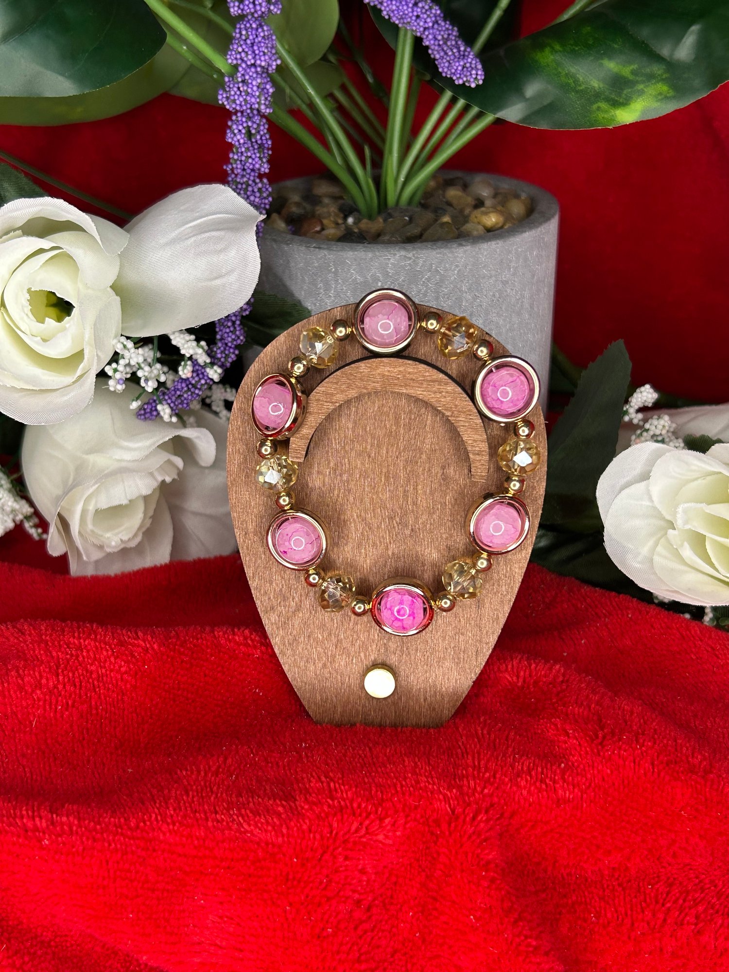 Fashion bracelet with light pink/ purple domed beads, accented by faceted gold