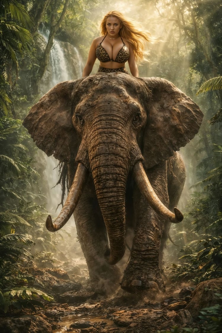 Step into the wild at full cinematic scale. In this 15K ultra-high-resolution masterpiece, Samantha channels Sheena, Queen of the Jungle in a breathtaking moment of suspended motion—one hand gripping a vine, the other holding a gleaming blade, framed by emerald canopy and golden sunbeams cutting through the mist.