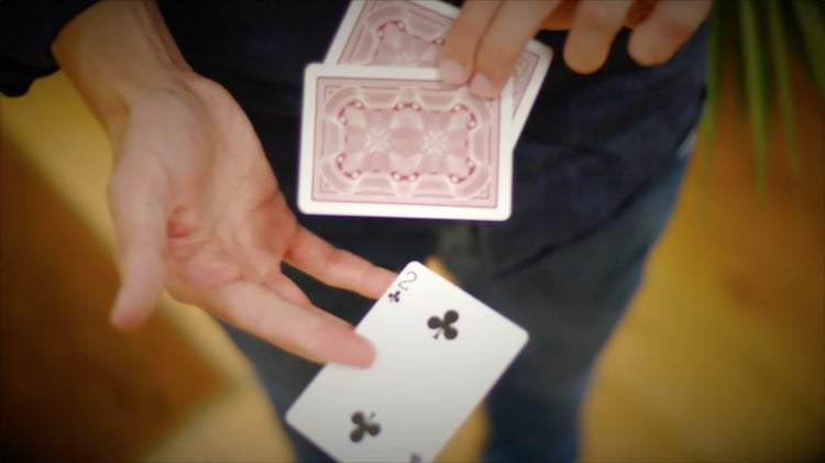 Take another card and cover it with the blue card. Visually, the card under the blue card changes into the spectator's card with just simple push.