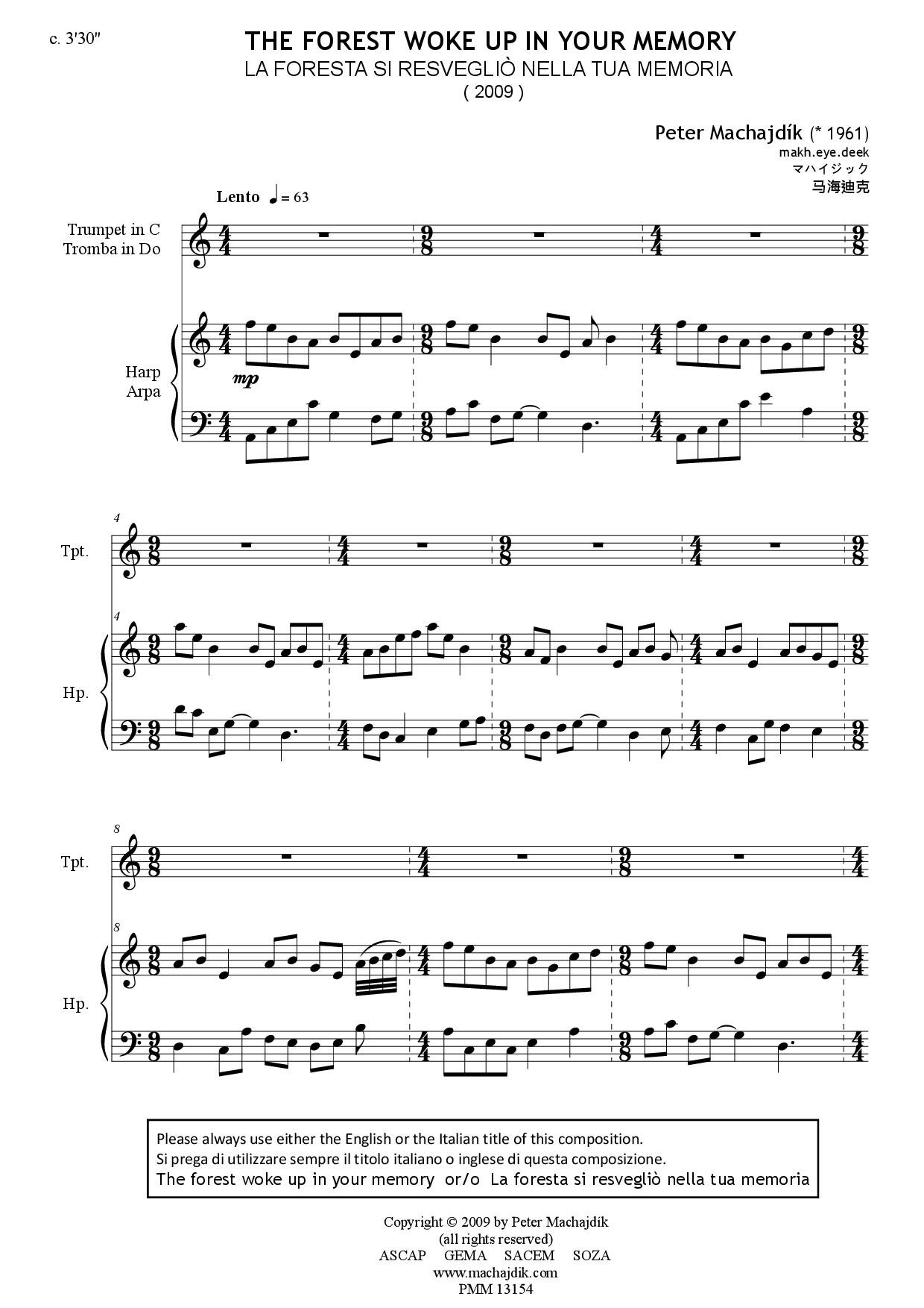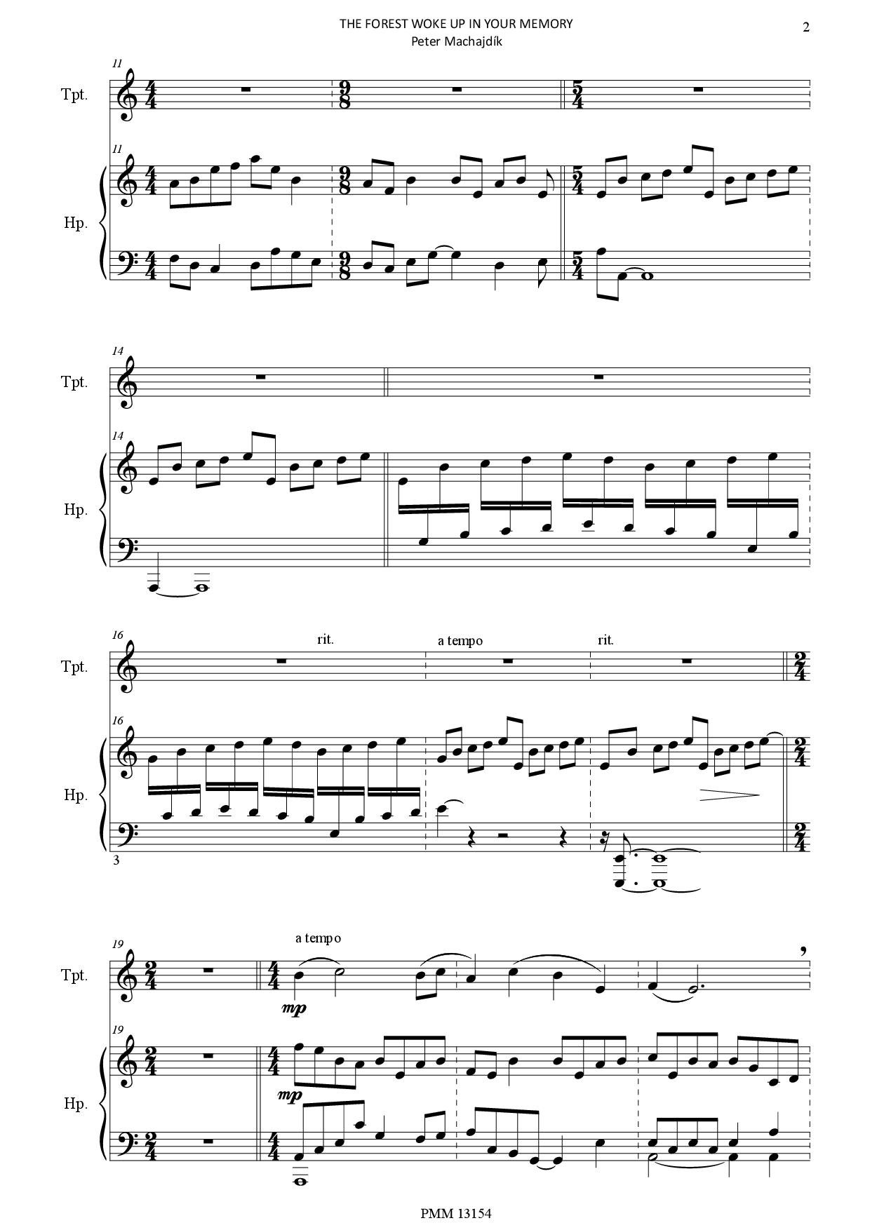 Peter Machajdik: THE FOREST WOKE UP IN YOUR MEMORY for trumpet and harp (score and trumpet part)